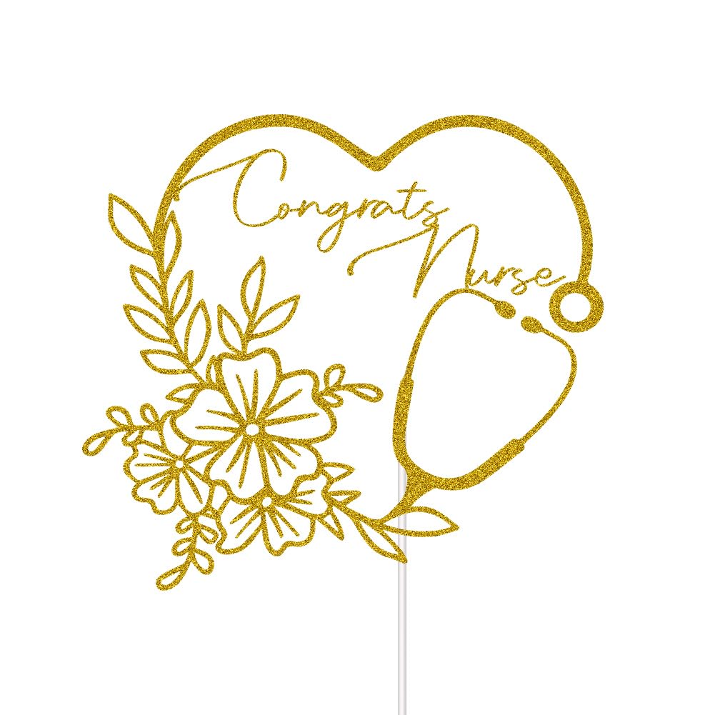 Q: What material is the Congrats Nurse Cake Topper made of?A: The Congrats Nurse Cake Topper is made of premium cardstock with gold glitter, ensuring a sturdy and attractive design.