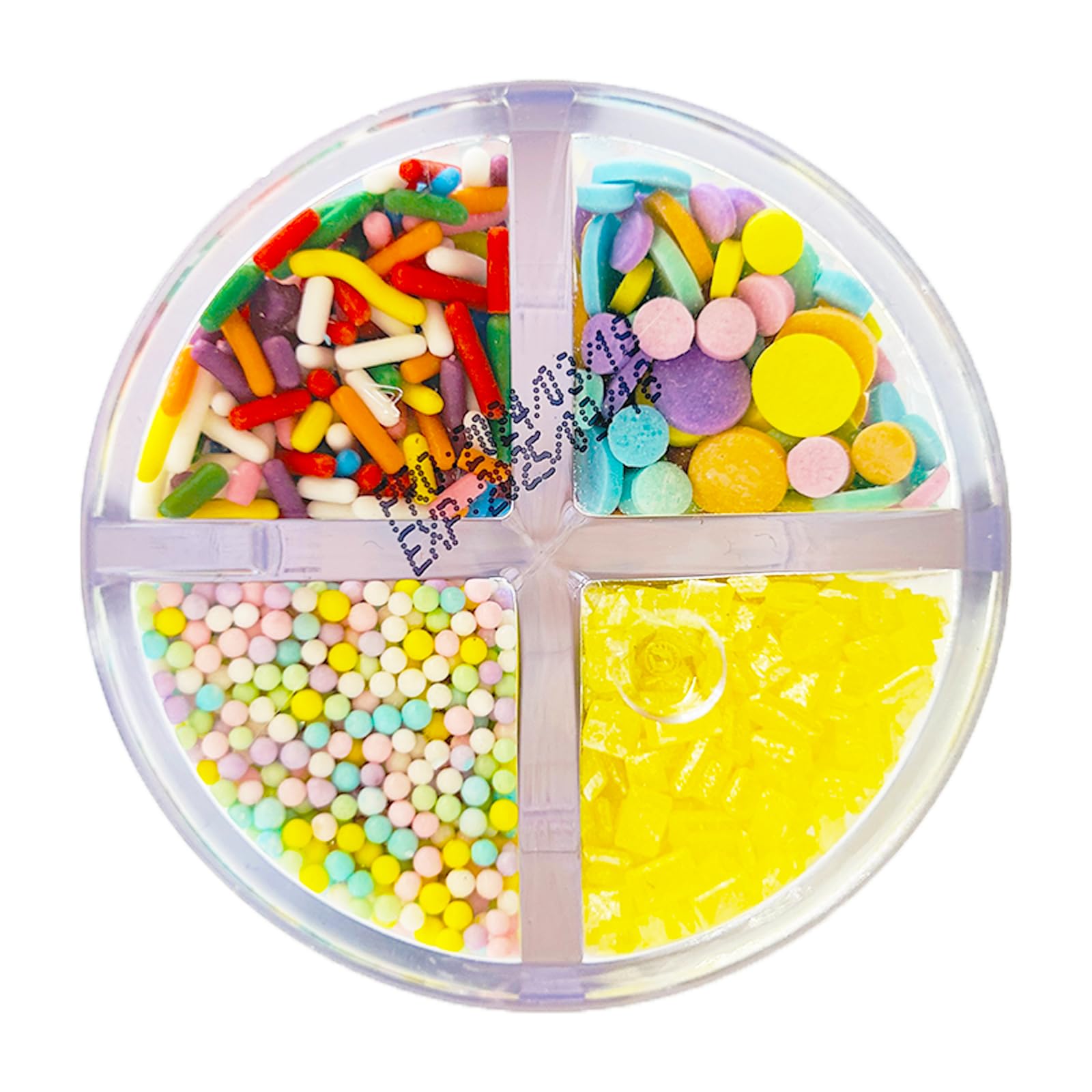Q: What types of sprinkles are included in the Cookie Sprinkles Decorating Supplies?A: The Cookie Sprinkles Decorating Supplies include a variety of sprinkles such as confetti sprinkles, rainbow Jimmies sprinkles, nonpareils sprinkles, and yellow sanding sugar sprinkles, all presented in a convenient 4-compartment bottle.