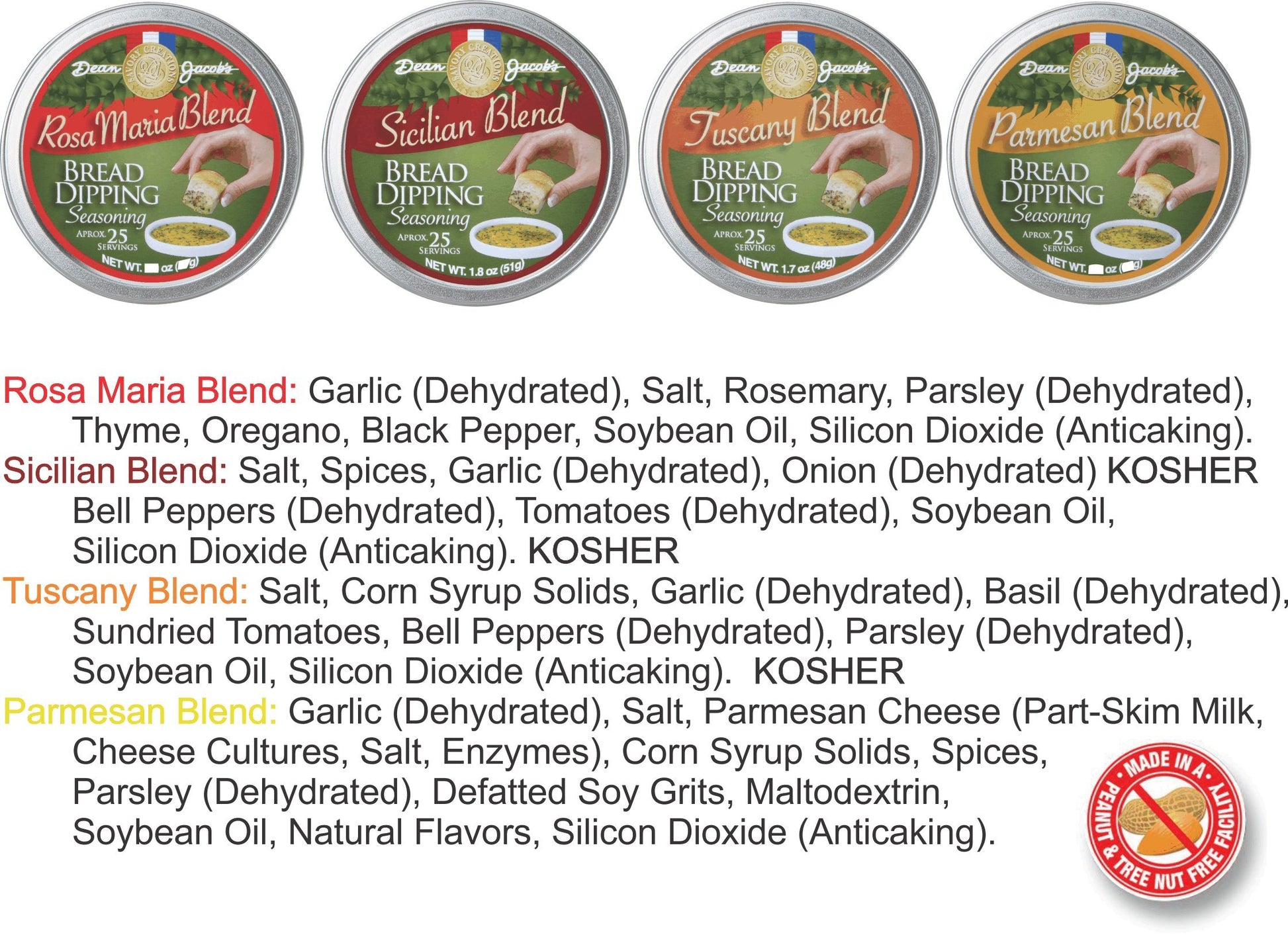 - Q: What are the different bread dipping seasonings included in Dean Jacob's collection? A: Dean Jacob's 9 pc. Collection features four distinct bread dipping seasonings: Traditional Sicilian Blend, Rosa Maria with Rosemary & Garlic, Tuscany Blend with Sun-dried Tomato & Basil, and Parmesan Blend with Roasted Garlic & Cheese.