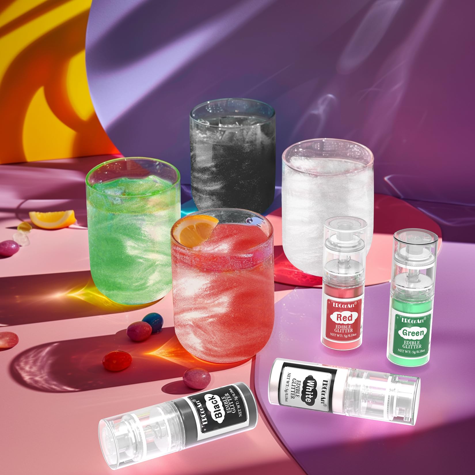 - Q: What colors are available in the edible glitter spray? A: The edible glitter spray comes in four luxurious metallic colors: White, Green, Red, and Black. Each color can enhance the visual appeal of various desserts and drinks.
