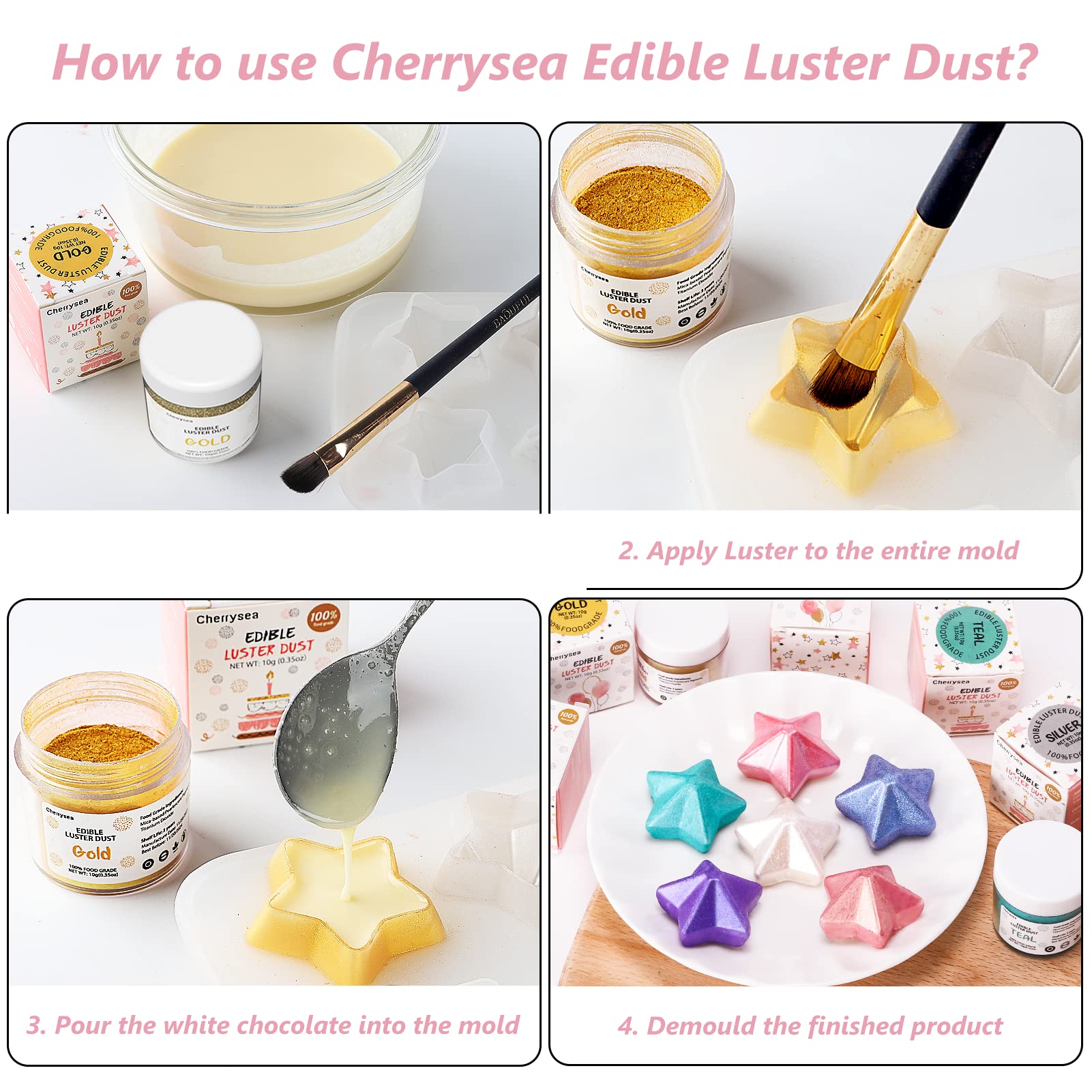 - Q: How do I apply the luster dust for the best results? A: For optimal results, apply the Edible Luster Dust evenly over your food. For a more intense shine, you can dilute it with alcohol (like vodka) or lemon extract oil-based flavoring and apply it using a brush.