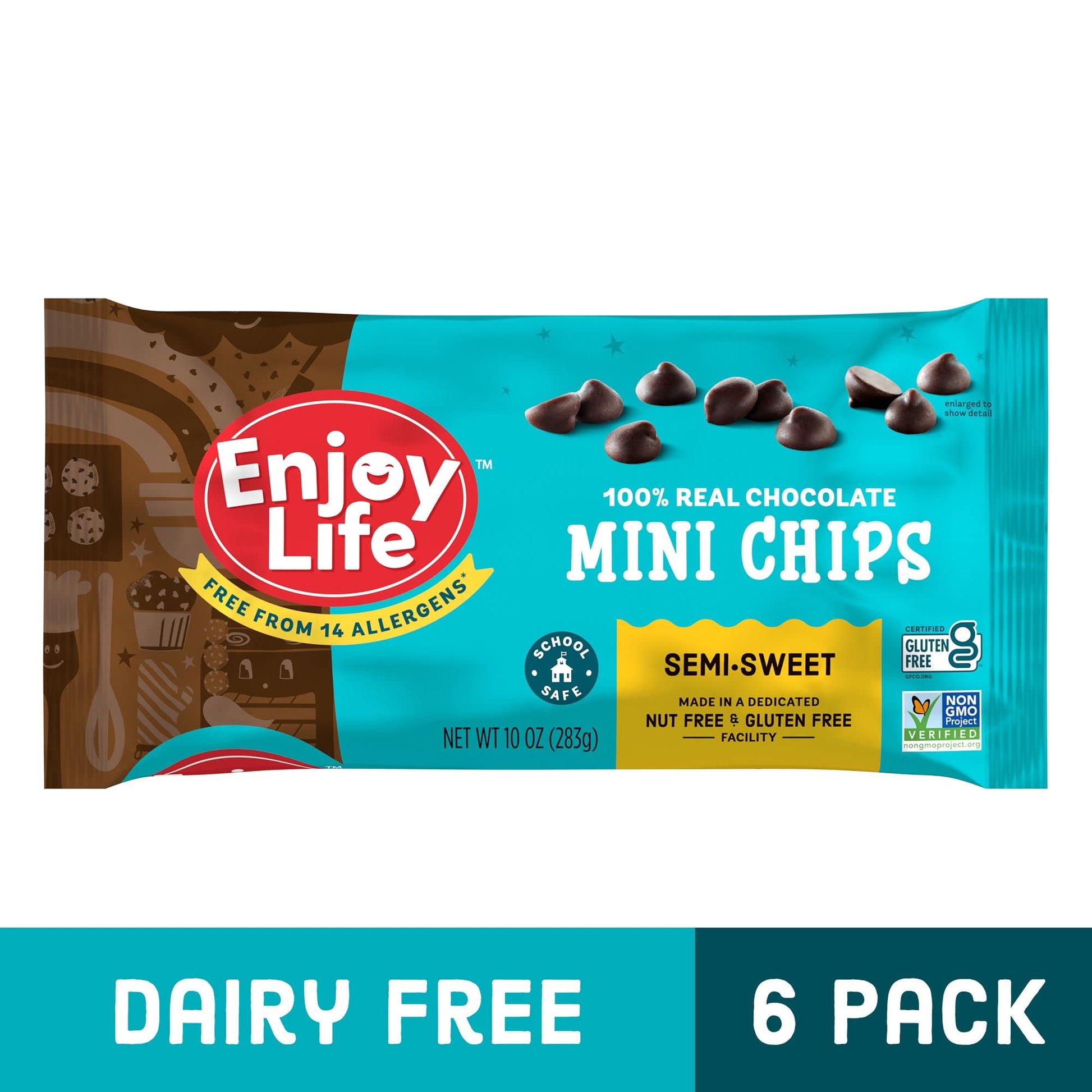 Q: What allergens are free from Enjoy Life chocolate chips?A: Enjoy Life Semi-Sweet Mini Chocolate Chips are free from 14 common allergens, including peanuts, tree nuts, dairy, soy, and eggs, making them a safe choice for individuals with food sensitivities.