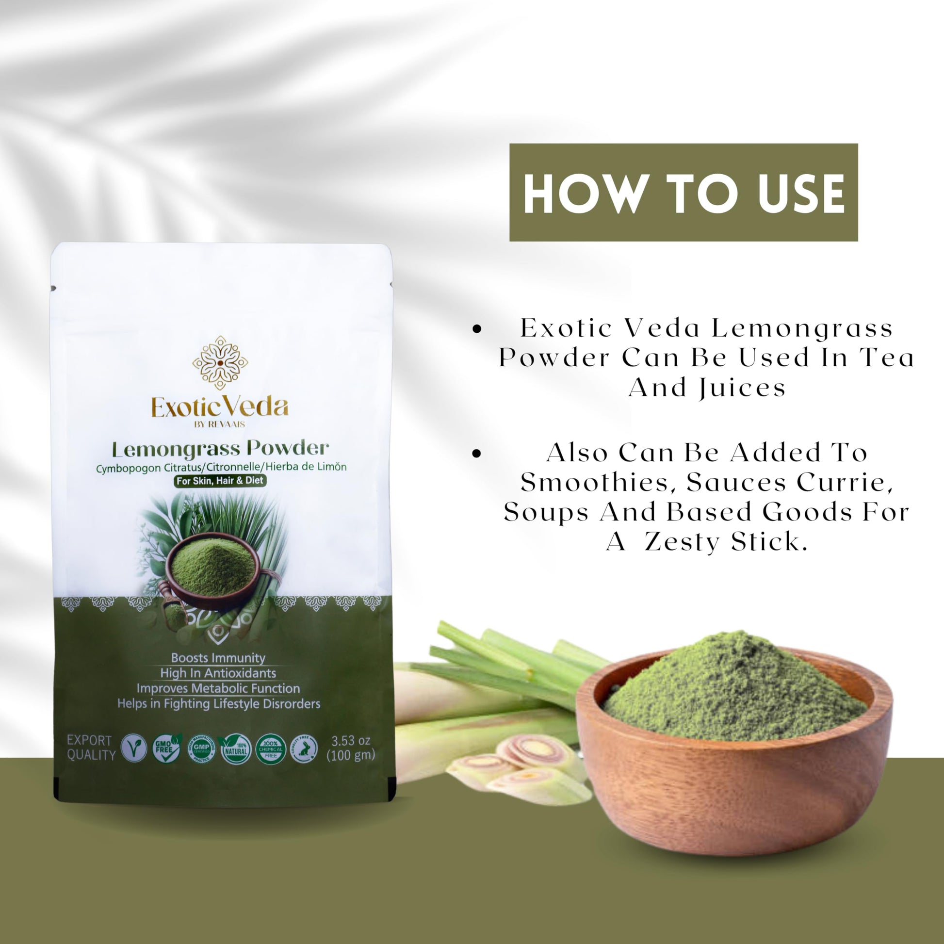 Q: What are the health benefits of using Exotic Veda Organic Lemongrass Powder?A: Exotic Veda Organic Lemongrass Powder is rich in antioxidants and is known to aid digestion. It also provides a significant source of Vitamin C, which is essential for immune support and overall wellness.