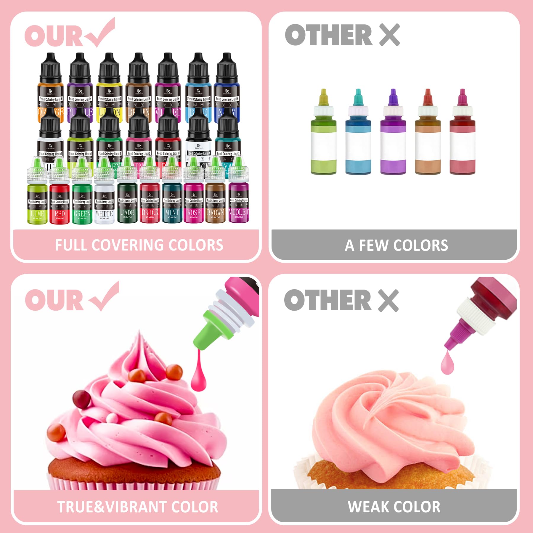 Whether youre making frosting or a whipped topping for a baked good or coloring your own slime, our colors stay true and vibrant in the most challenging of environments, making it perfectly reliable for any at-home project. Create the masterpiece you have in mind with the finest food coloring! Tips: 1. Each dye might have different consistency and some treats will require more dye than others. So in order to avoid ''overdose'', make sure to add a little at a time to see what color you want to achieve. 2. Because of high concentration, shake well before each use to achieve better results.
