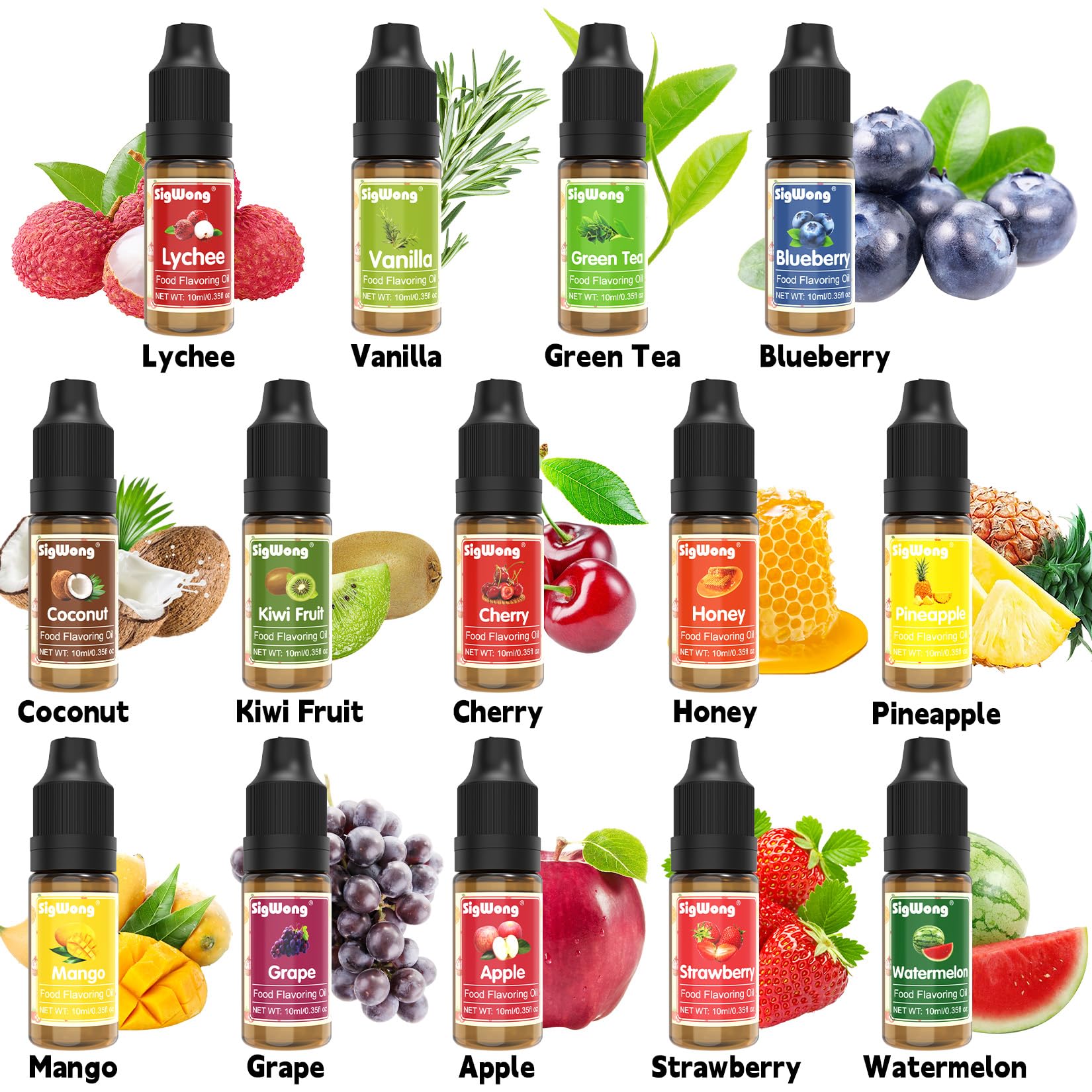 Product description:Our food flavoring oil is food grade ingredients, Non-GMO, gluten free, diary free, sugar free, vegan. Specially tested to ensure that every scents is amazing!14 different popular flavors included:strawberry, apple, grape, coconut, watermelon, vanilla, mango, kiwi fruit, cherry, pineapple, honey, lychee, Blueberry, green tea.Use them to make a great gift or use it yourself.USAGE:Use in moderation in candy making process.Use a few drops in soap making process.FEATURES:Fragrance diffusionConcentratePure NaturalHarmlessPACKAGE INCLUDES:14 bottles of food flavoring oils(10ml)