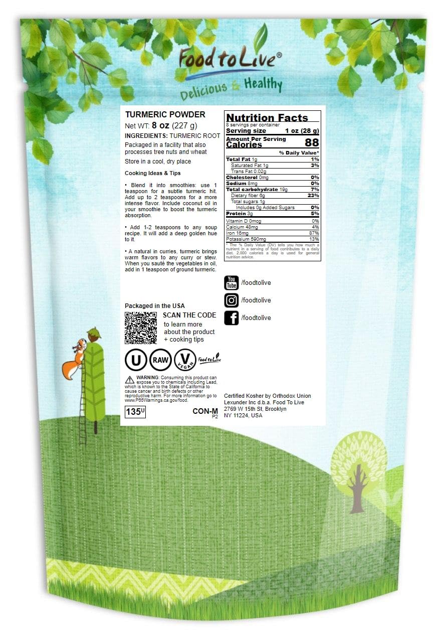 Q: What are the health benefits of using Food to Live Turmeric Powder?A: Food to Live Turmeric Powder is rich in antioxidants and contains curcumin, which may help reduce inflammation and boost overall health. It offers a small amount of essential nutrients like iron and manganese, making it a nutritious addition to your diet.