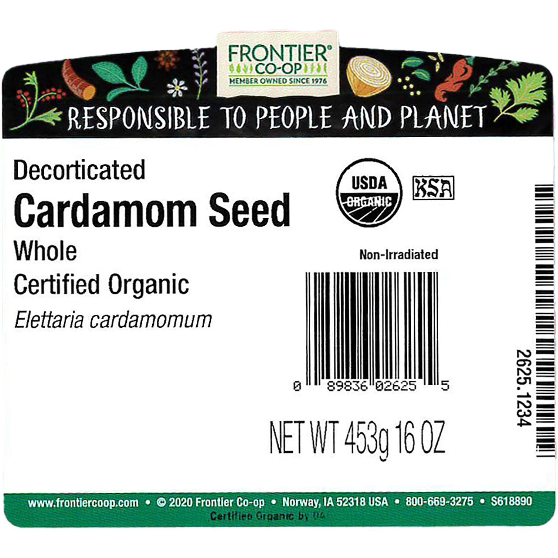 FEATURES 1 pound bulk bag (16 ounces) Certified organic, kosher, non-irradiated Decorticated for pureness and quality Highly versatile and aromatic Botanical name: Elettaria cardamomum