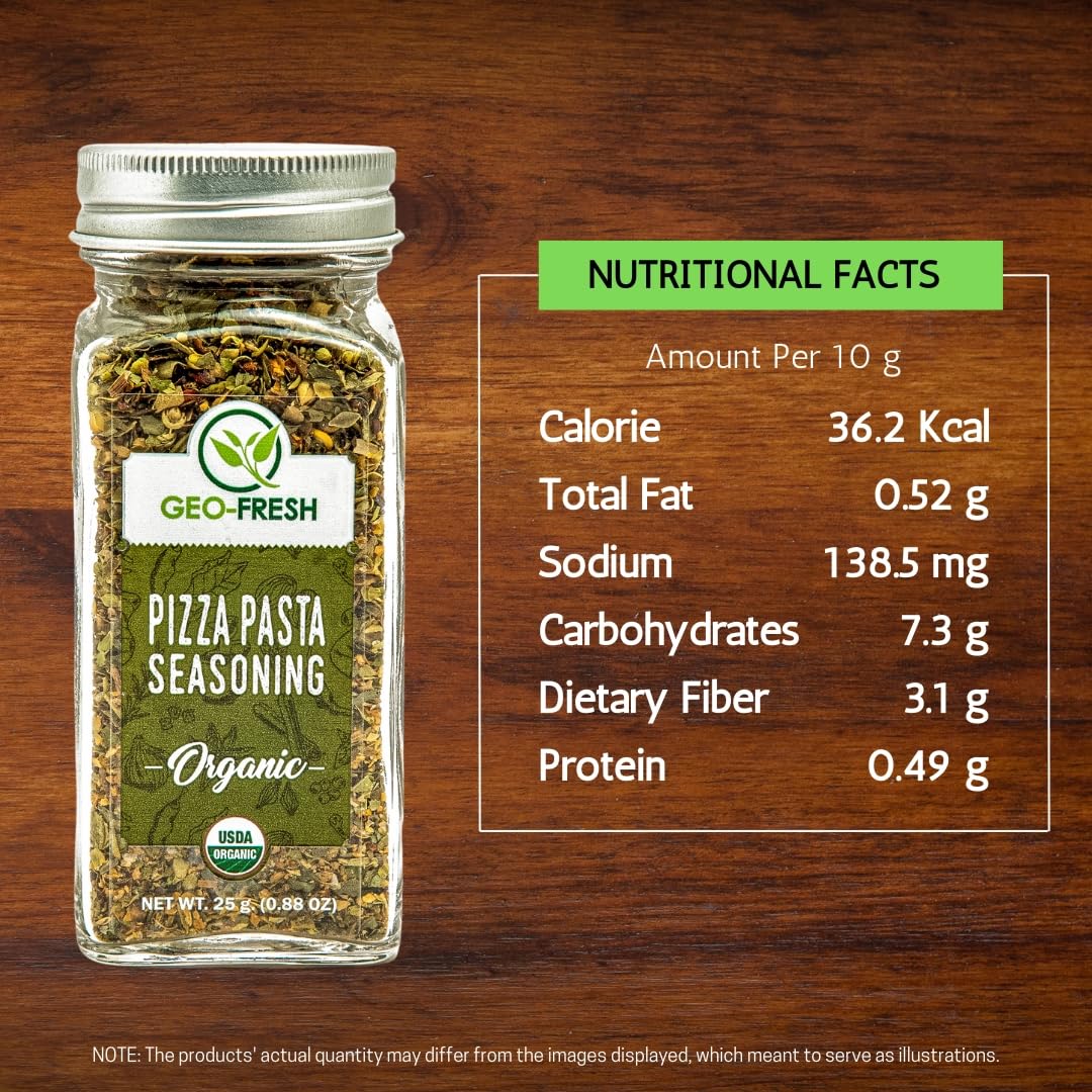 - Q: What ingredients are included in the Geo-Fresh Organic Pizza Seasoning? A: The Geo-Fresh Organic Pizza Seasoning features a premium blend of USDA certified organic ingredients, including oregano, basil, garlic, onion, and fennel seeds. This mix captures the authentic Italian flavors that enhance your homemade pizzas.
