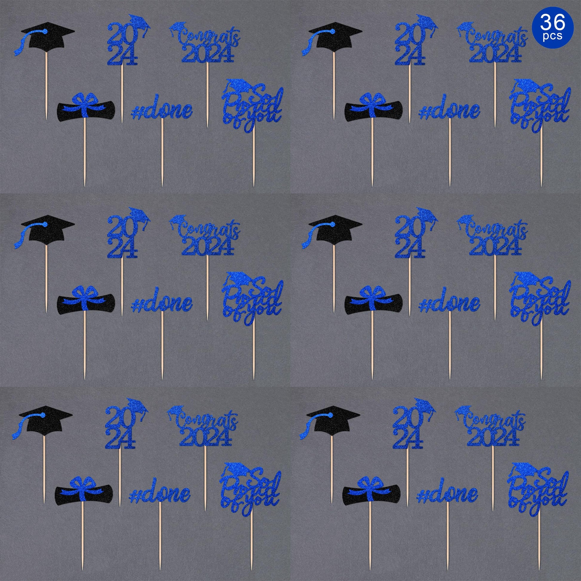 Q: What are the sizes of the cupcake toppers?A: The sizes of the cupcake toppers vary: '2024' measures 1.8x1.9 inches, the diploma is 2.2x1.1 inches, the cap is 2.5x1.6 inches, 'congrats 2025' is 2.8x1.5 inches, '#done' is 2.4x0.98 inches, and 'so proud of you' is 2.4x2.1 inches.