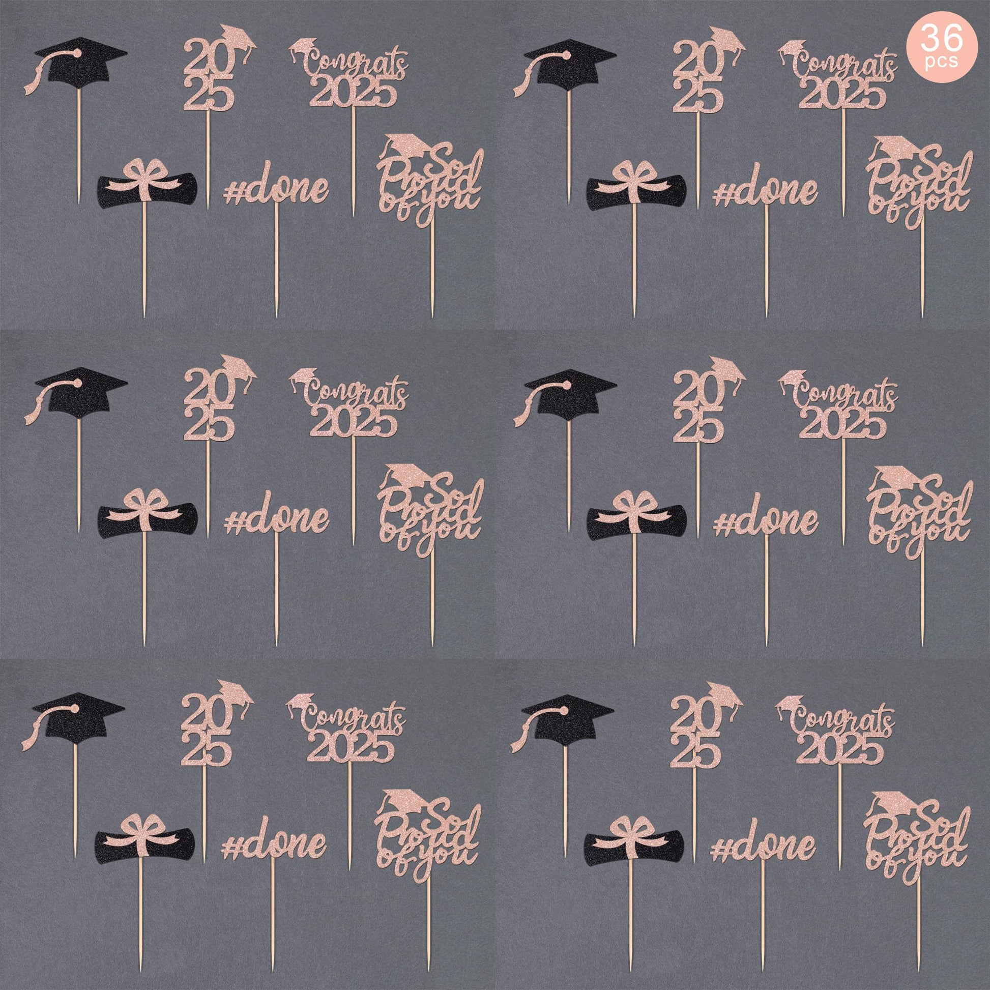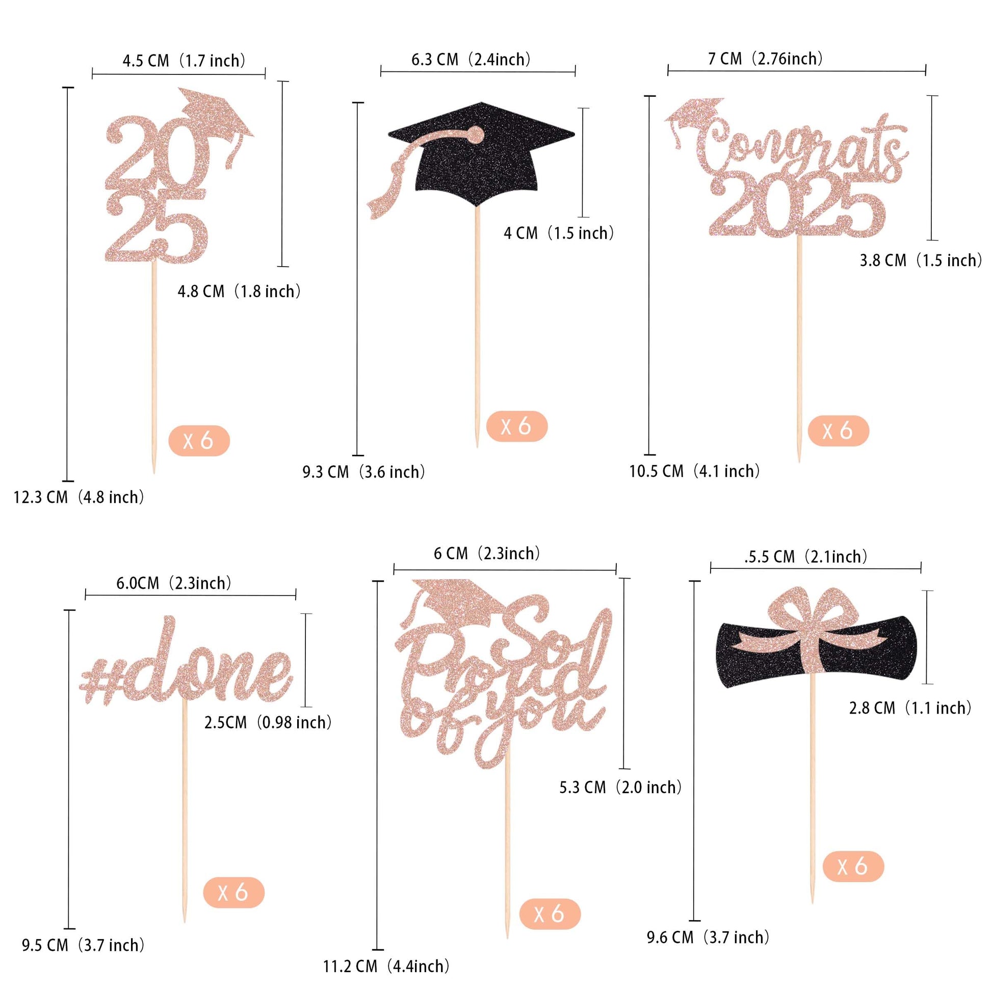 Q: How big are the graduation cupcake toppers?A: The sizes of the Gexolenu cupcake toppers vary: '2025' is 1.8 x 1.9 inches, the diploma is 2.2 x 1.1 inches, the cap is 2.5 x 1.6 inches, 'congrats 2025' is 2.8 x 1.5 inches, '#done' is 2.4 x 0.98 inches, and 'so proud of you' is 2.4 x 2.1 inches.