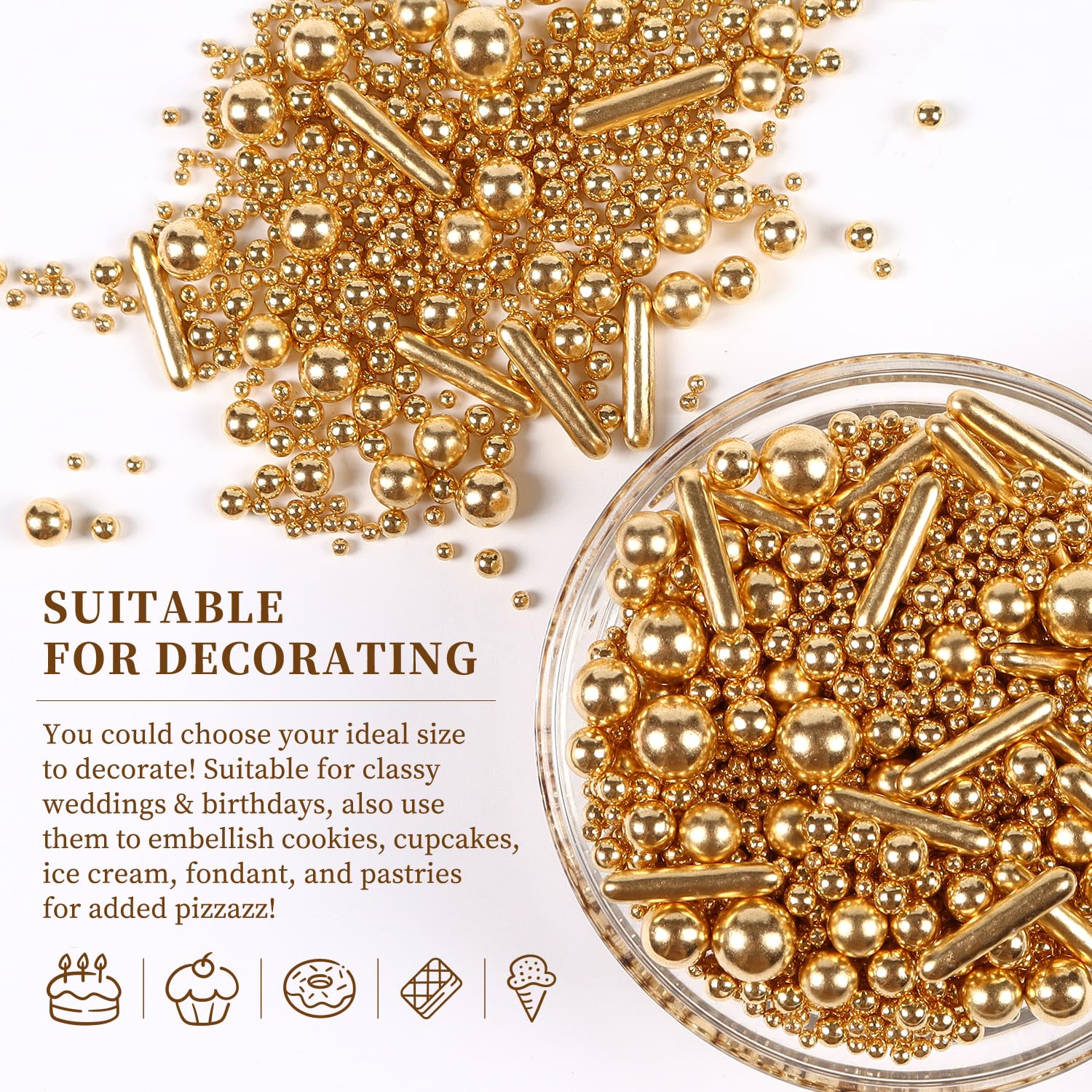 Q: What are Gold Pearl Sprinkles used for?A: Gold Pearl Sprinkles are perfect for decorating a variety of baked goods, including cakes, cupcakes, cookies, ice cream, and donuts. They add a sparkling touch to your desserts, making them ideal for celebrations like weddings, birthdays, and holidays.