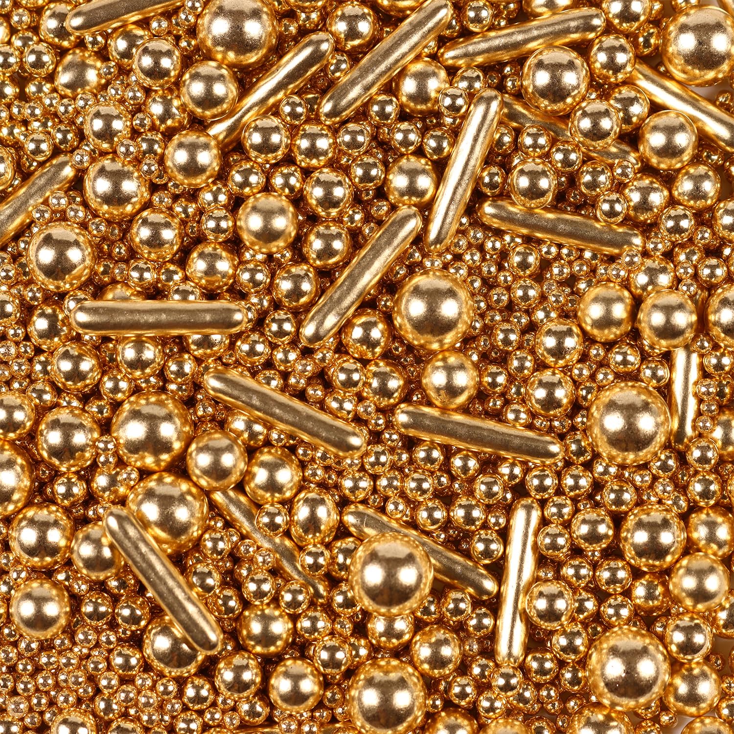 Q: What sizes do the Gold Pearl Sprinkles come in?A: The Gold Pearl Sprinkles include a mix of sizes, featuring pearl sprinkles in 2mm, 4mm, 6mm, 7mm, and 8mm, as well as pearl rods. This variety allows for creative decorating options.