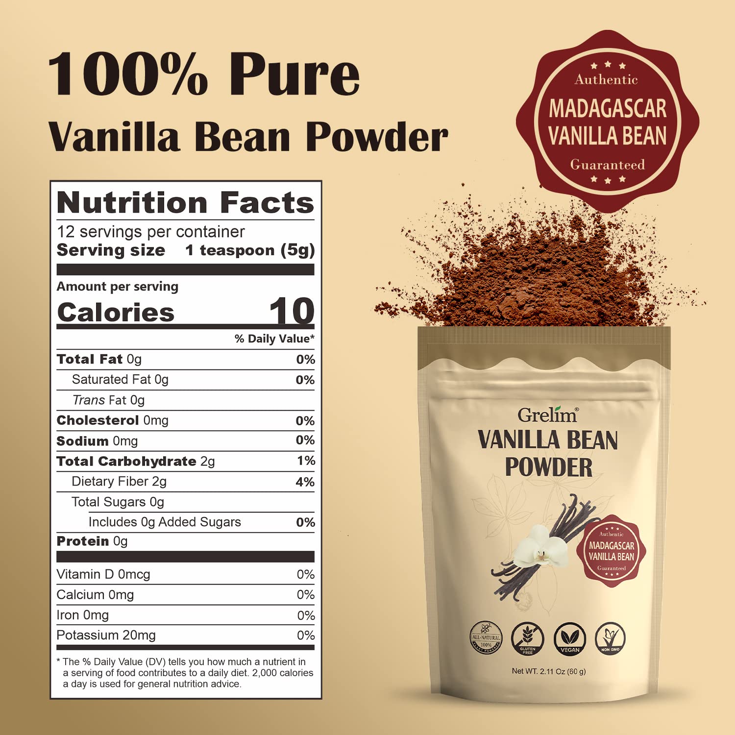 Q: What makes GRELIM Vanilla Bean Powder different from other vanilla products?A: GRELIM Vanilla Bean Powder is made from superior grade A Madagascar vanilla beans, known for their rich aroma and flavor. The beans are hand-selected, dried, and ground to ensure the highest quality without any artificial ingredients.