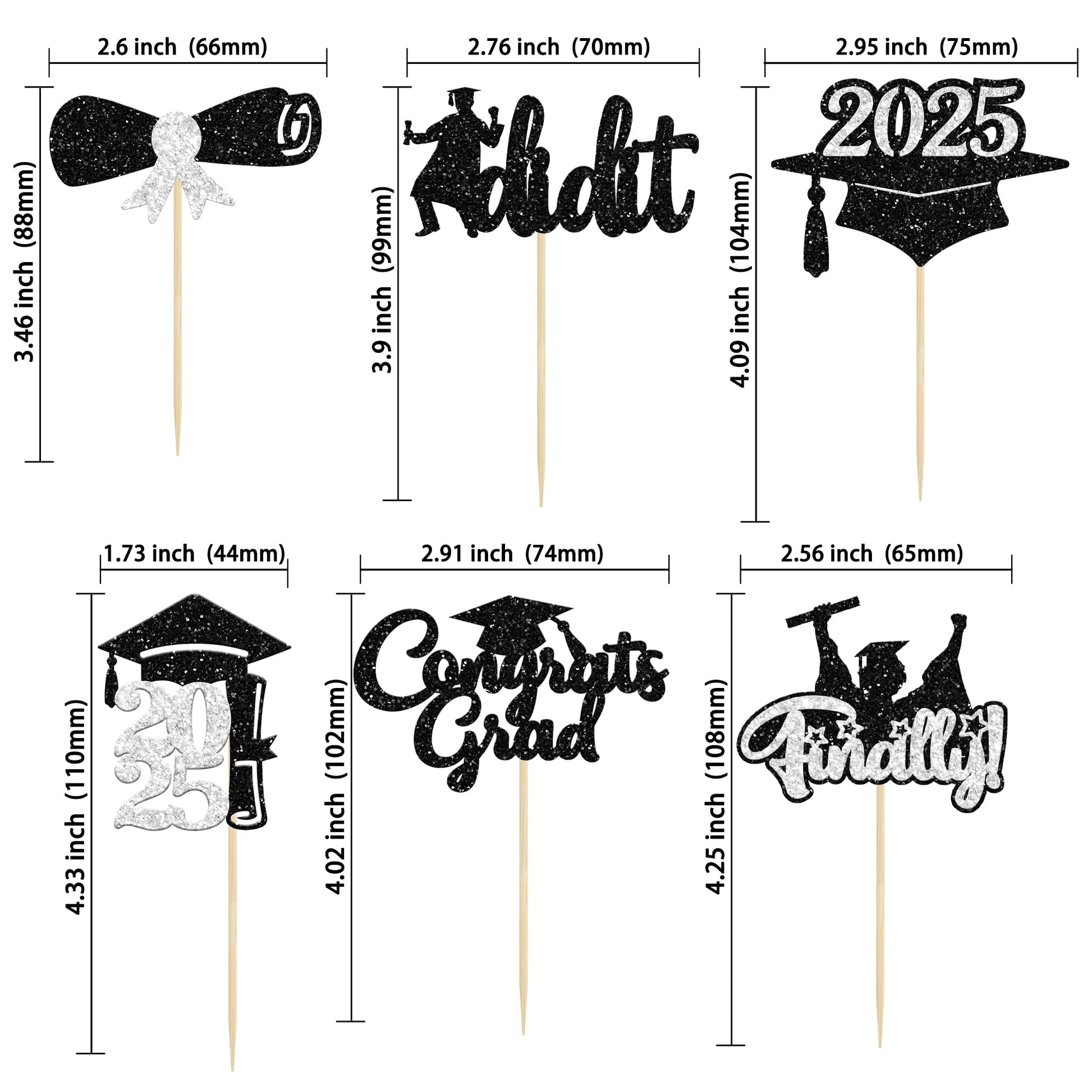 Q: What is the size of the Graduation Cupcake Toppers?A: Each topper measures approximately 2.8 inches in width and 4.3 inches in height, including the stick, making them perfect for a variety of desserts.