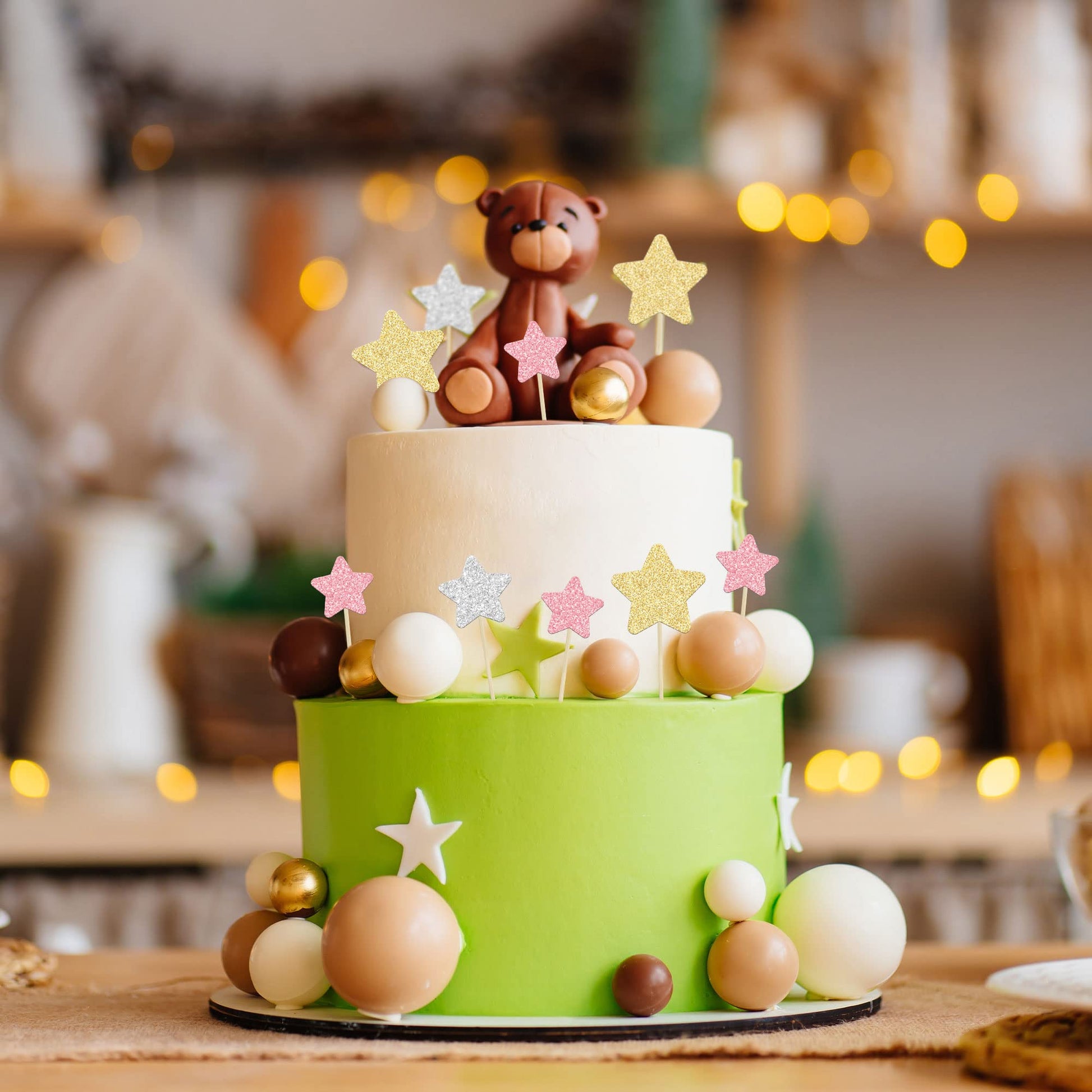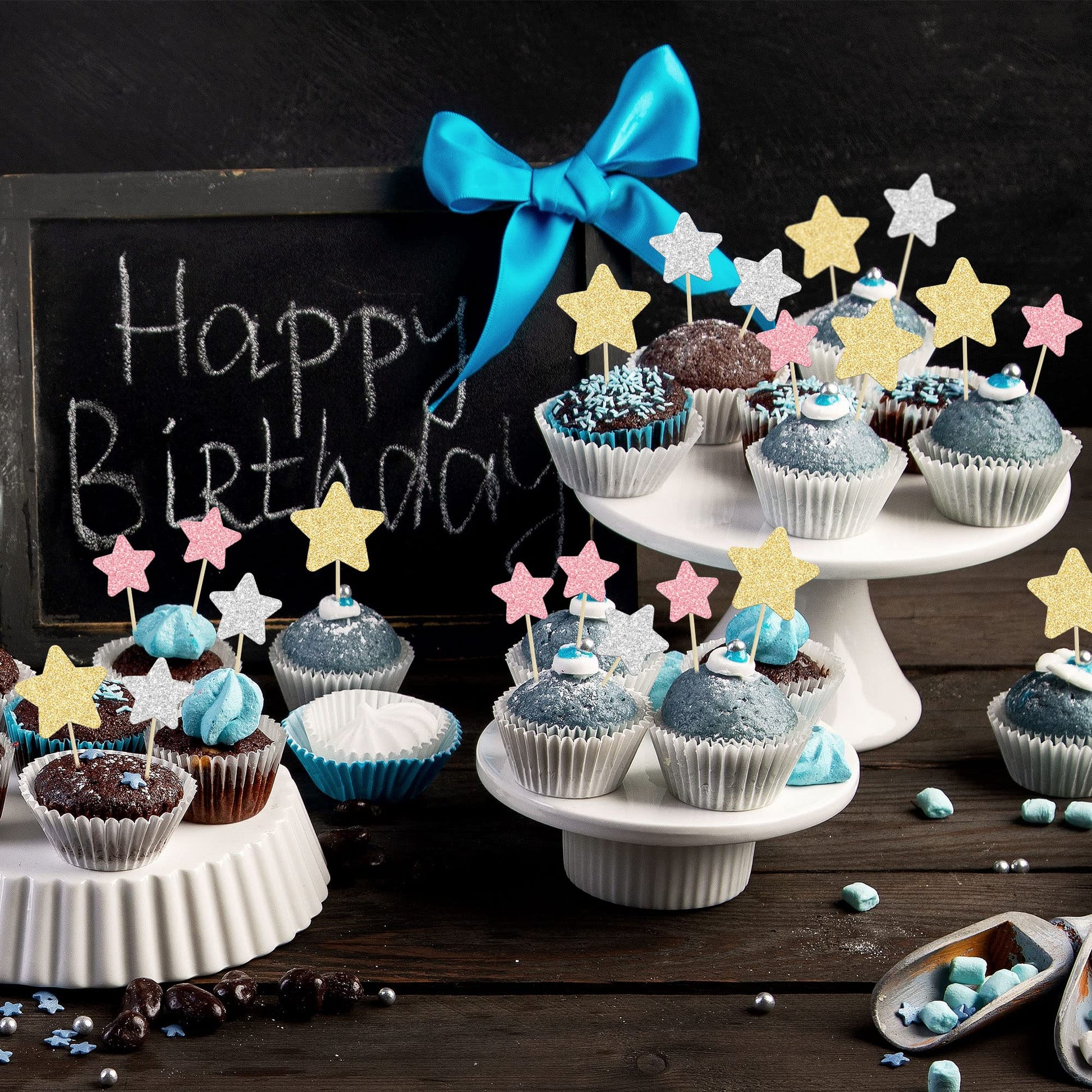 Q: Are the Star Cupcake Toppers safe to use on food?A: Yes, the Star Cupcake Toppers are made from high-quality 300 gram glitter card stock and food-grade toothpicks, making them safe for use on cakes, cupcakes, and other desserts. However, they are for decorative purposes only and should not be placed in the oven or microwave.