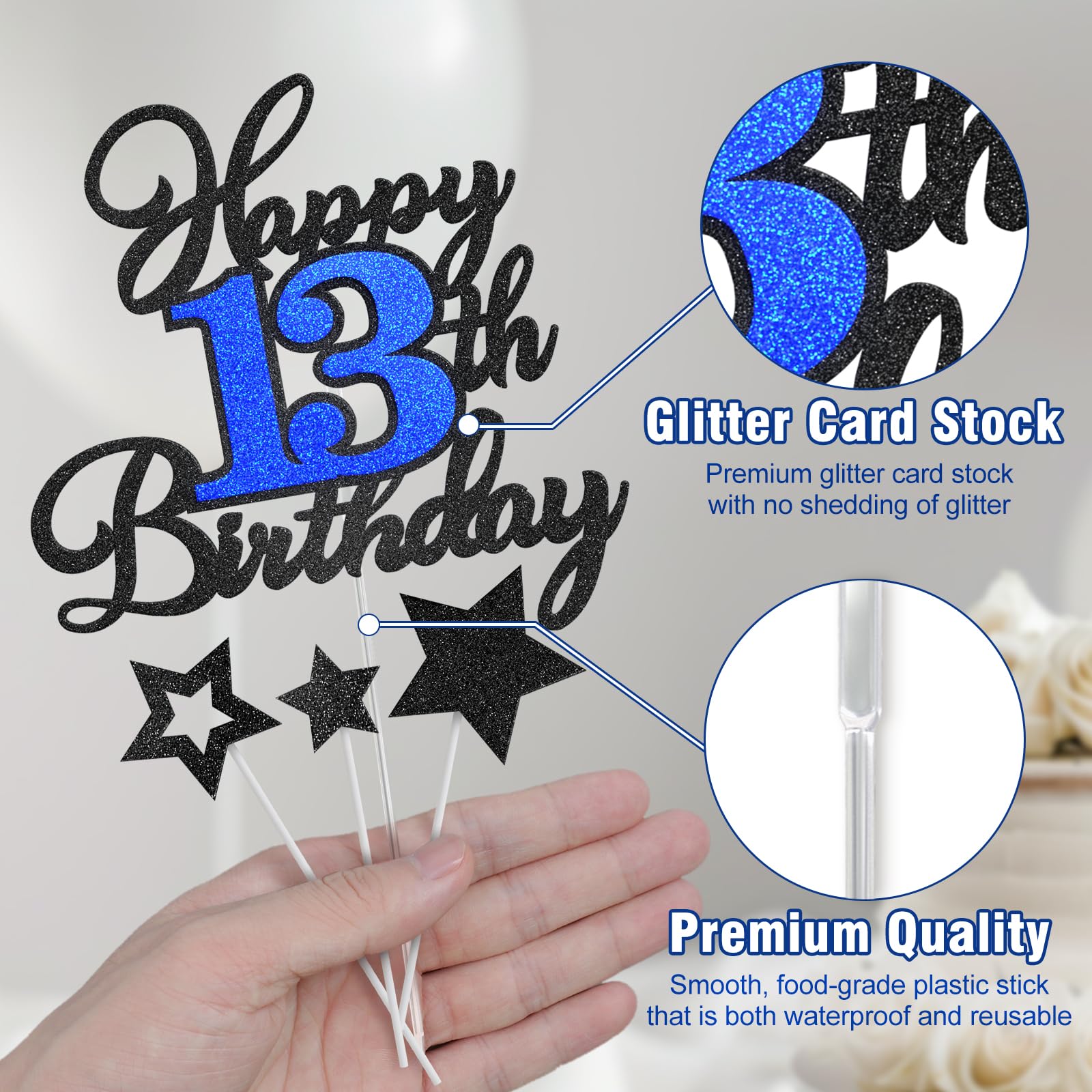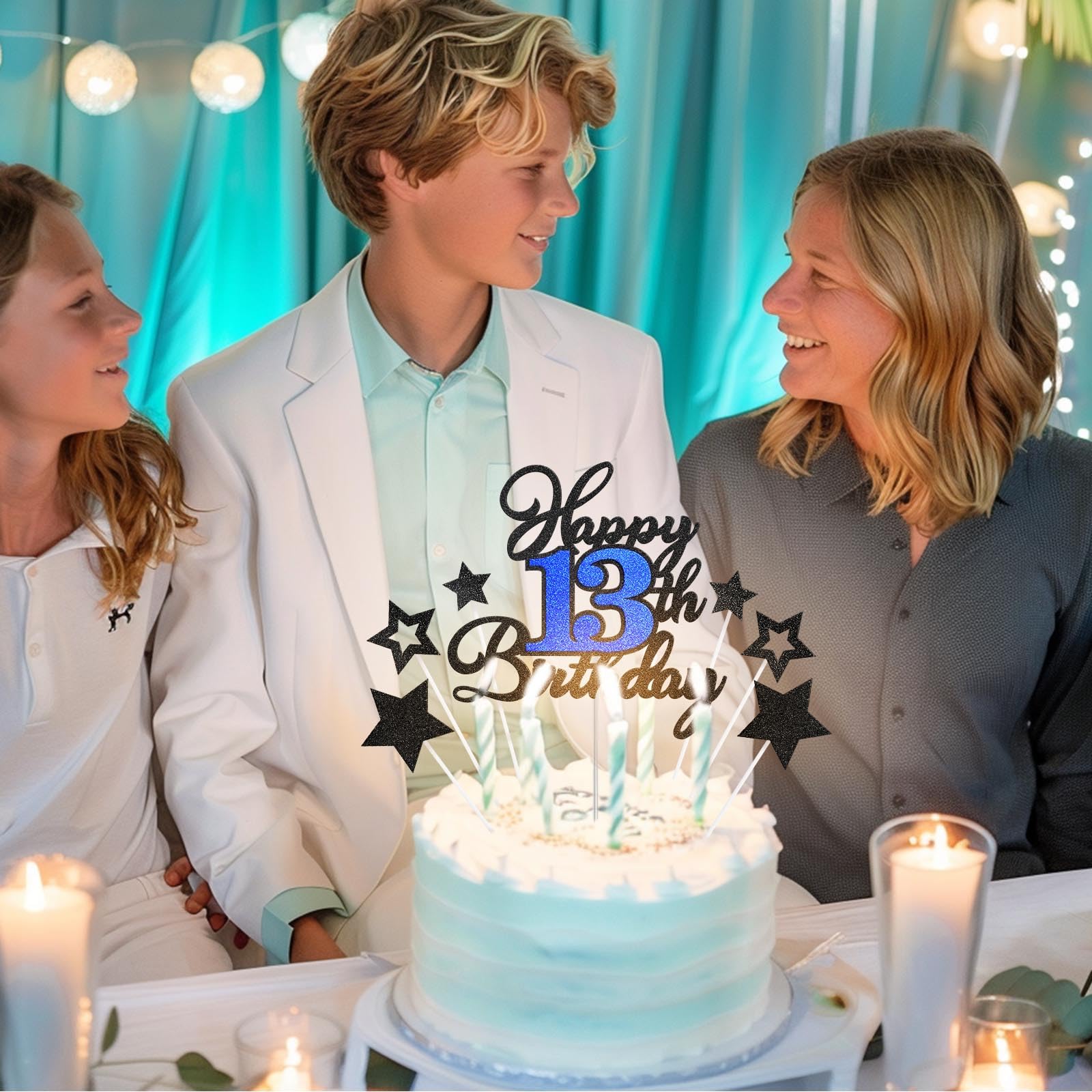 - Q: What is included in the Happy 13th Birthday Cake Toppers set? A: The set includes 1 Happy 13th Birthday cake topper, 1 food-grade clear plastic stick, 6 black glitter stars, 6 white plastic sticks, and 10 adhesive dots, providing everything you need for a festive cake decoration.