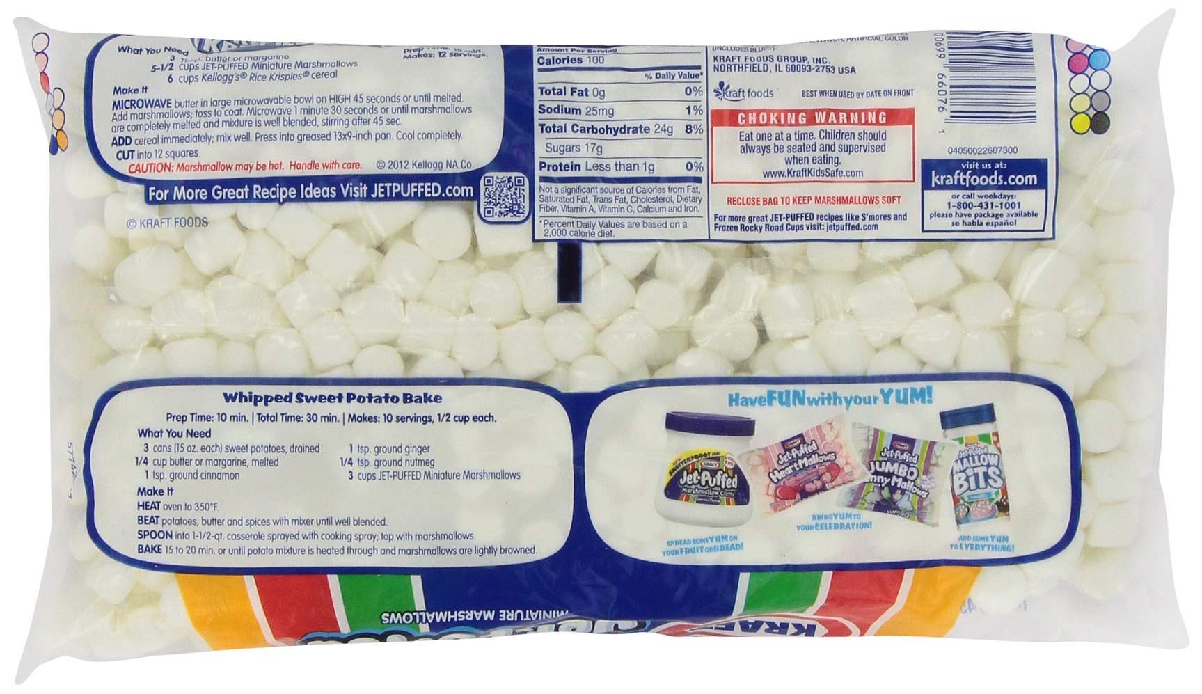 - Q: What is the packaging size for Jet Puffed Mini Marshmallows? A: Jet Puffed Mini Marshmallows come in 16-ounce bags, and this product is available in a pack of 6, providing you with plenty of marshmallows for all your snacking and baking needs.