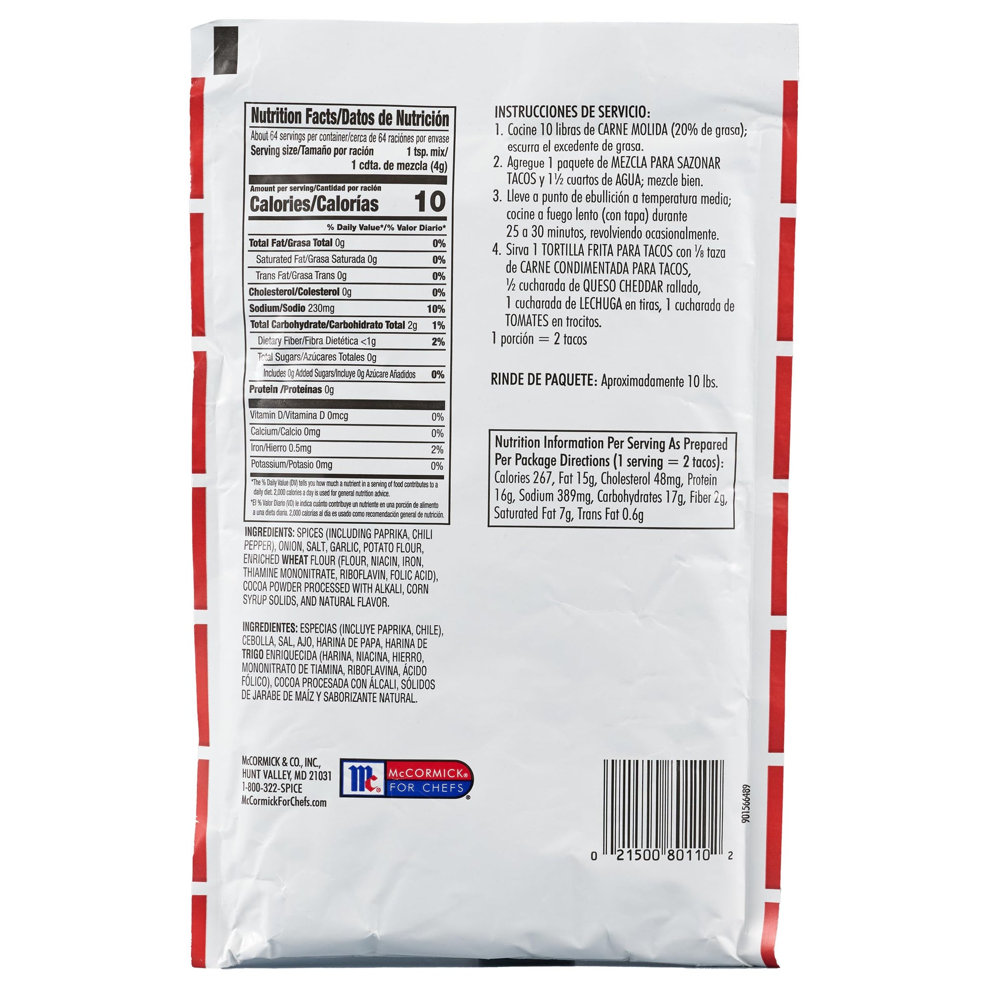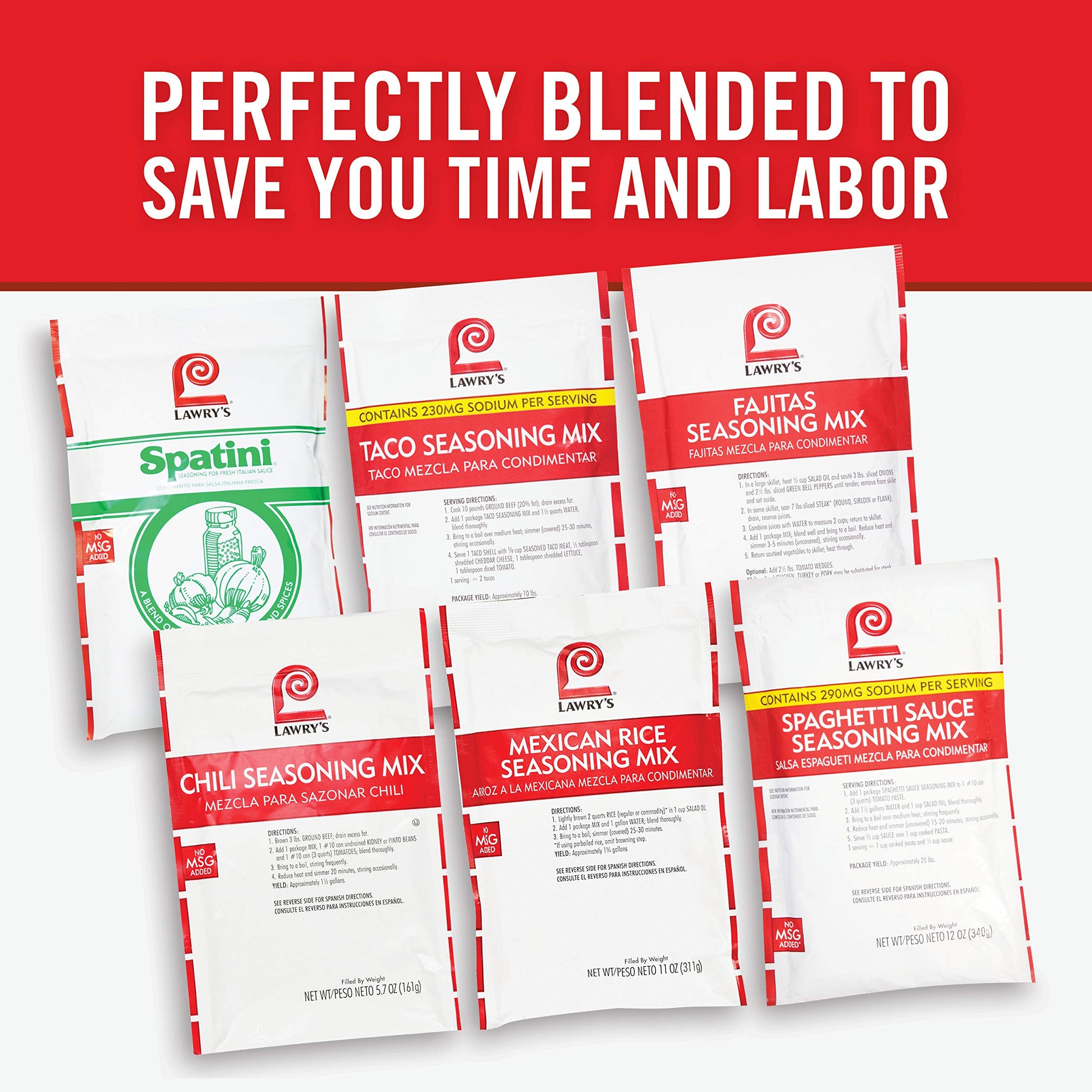 Give your customers the medium heat they crave with Lawrys Taco Seasoning Mix. With this pre-mixed packet, delivering consistent, bold flavor is possible every time. While its traditionally used for tacos, this versatile blend can also liven up other chicken, pork and vegetable recipes, giving you endless options for shaking up taco night or creating extraordinary menus. These taco seasoning packets contain only carefully selected, top-quality ingredients. A combination of herbs and spices achieves this iconic flavor with some chile pepper and paprika for additional heat. This blends full-bodied warmth comes from spices like cumin, oregano, onion and garlic. Lawrys Taco Seasoning Mix is made specifically with culinary professionals in mind. Each packet contains 9 ounces of pre-mixed seasoning, saving you time and effort compared to measuring and mixing individual spices. These packets contain enough seasoning to add some fun and flavor to up to 10 pounds of meat. Whats more, prep instructions are printed in both English and Spanish, so you can expect ultimate consistency and enhanced efficiencies. Since the packets are already pre-measured, all you have to do is stir the seasoning right into your fajita or taco filling for a classic, craving-inducing taste. Youll be serving dishes full of on-trend flavor and visual appeal in minutes. This easy-to-use blend also works well in burger and meatloaf recipes. Want to add restaurant-proven boldness to your condiments? Mix a little into dips or sauces and create your own unique recipe. The combination of spices and herbs pairs well with everything from casseroles to vegetables. While these bulk taco seasoning packets bring some flavor and fire to your kitchen, they also make it easy for you to craft dishes your customers can feel good about indulging in. The blend is kosher and made without artificial flavors, colors or added MSG.