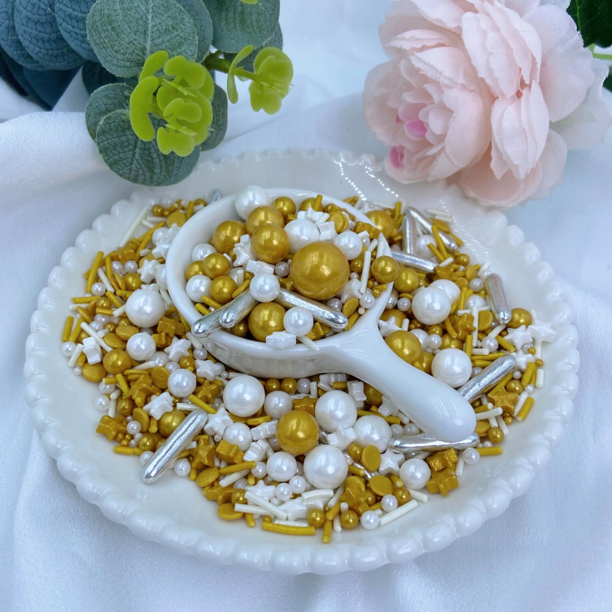 Littlestar Sprinkles - White Deluxe Gold Sprinkles For Cake Decorating 4 Ounce - Sugar Mix Pearl Sprinkles For Cupcake Toppers, Ice Cream, Candy, Cookie Decorations - Holiday Party Supplies