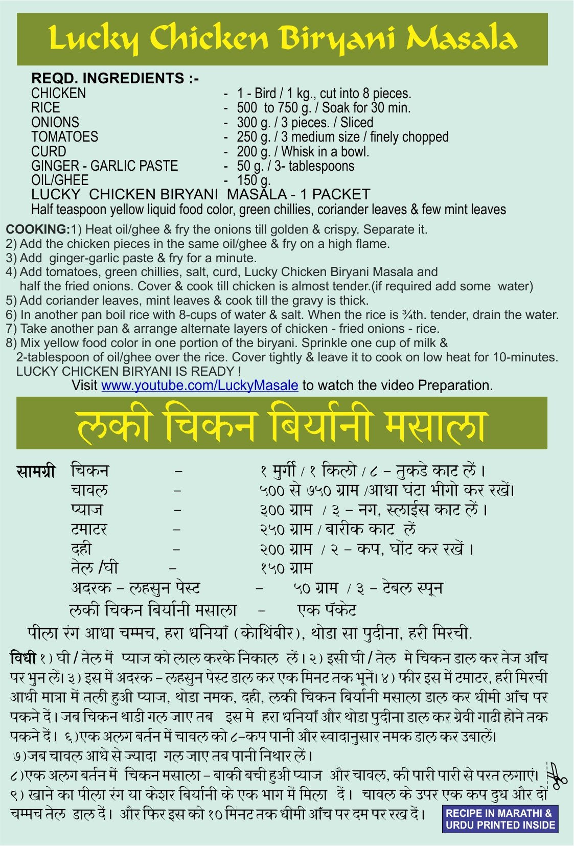 - Q: What is Lucky Biryani Masala and how is it used? A: Lucky Biryani Masala is a spice mix designed for making flavorful Chicken Biryani. It includes a blend of the finest Indian spices and herbs. To use, simply follow the recipe included on the packaging, which guides you through frying onions, cooking chicken with the masala, layering it with partially cooked rice, and finishing the dish by 'dumming' it on low heat.