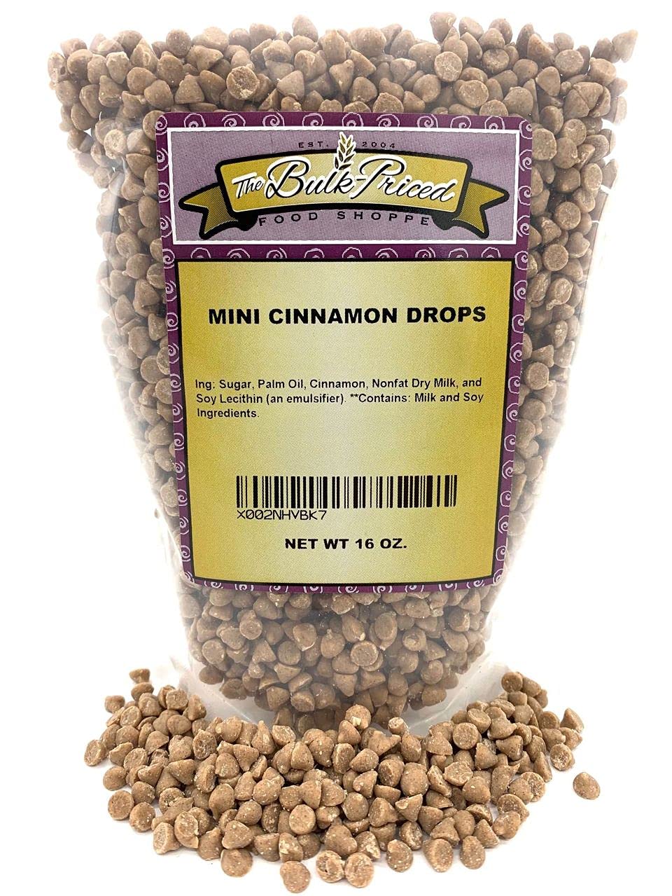 - Q: What ingredients are in Mini Cinnamon Drops? A: Mini Cinnamon Drops are made from sugar, palm oil, cinnamon, nonfat dry milk, and soy lecithin, which serves as an emulsifier. Please note that they contain milk and soy, so check for allergies before use.