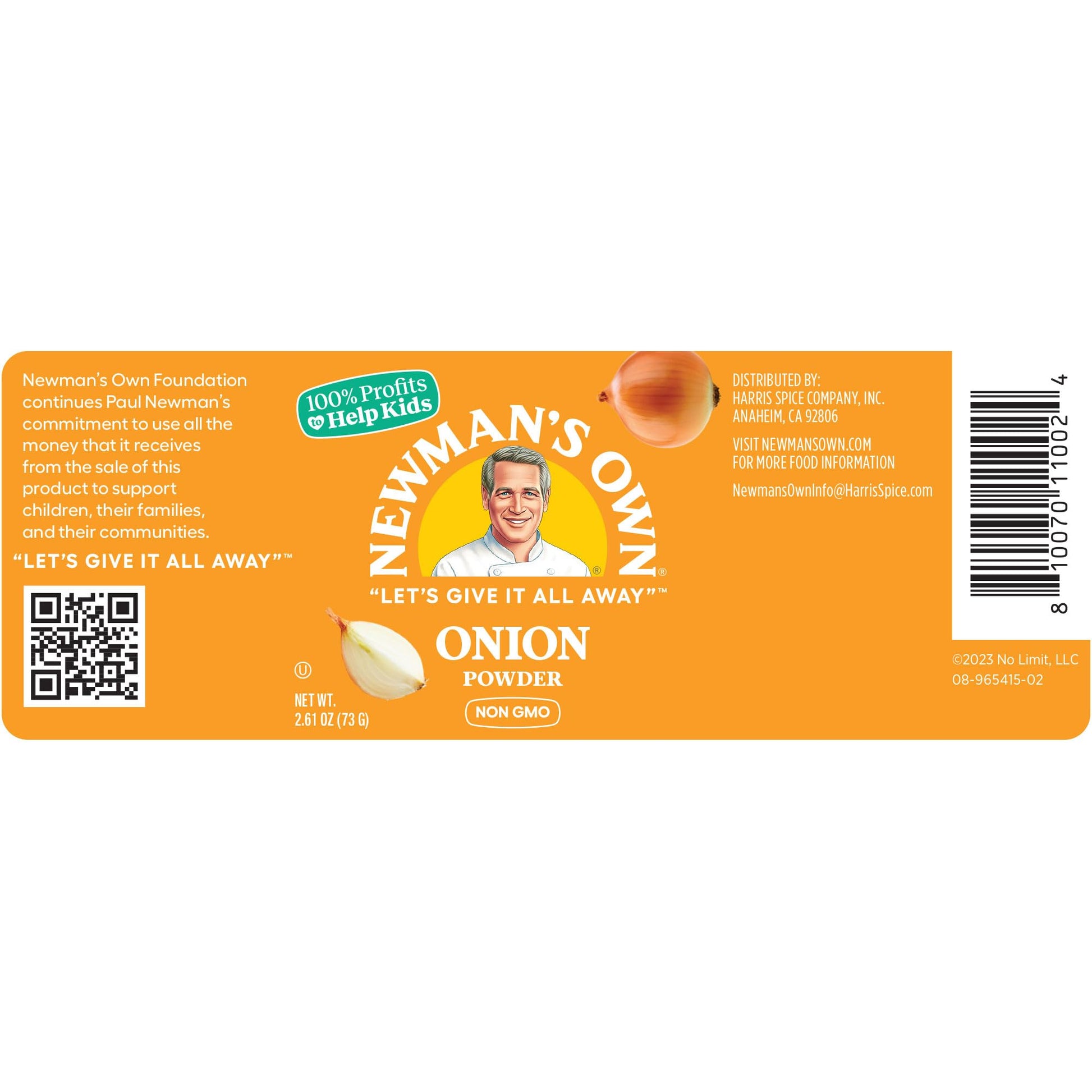 Q: What is Newman's Own Onion Powder made from?A: Newman's Own Onion Powder is made from real, carefully dehydrated onions, ensuring a rich flavor that enhances a variety of dishes.