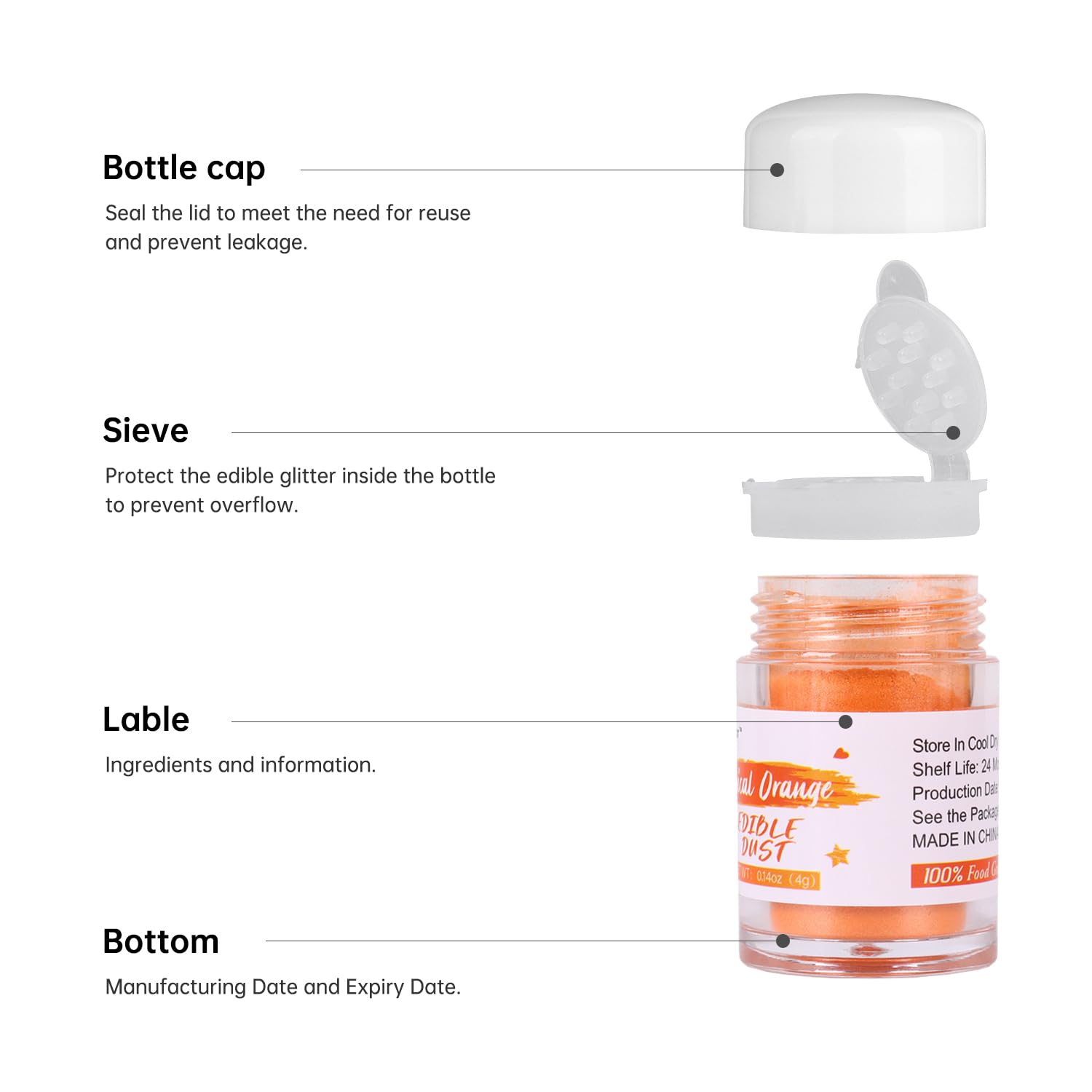 Q: Can this edible glitter be used in alcoholic drinks?A: Absolutely! The Orange Luster Dust can create a magical shimmering effect in vodka, cocktails, and other alcoholic beverages without altering their texture, making your drinks visually stunning.