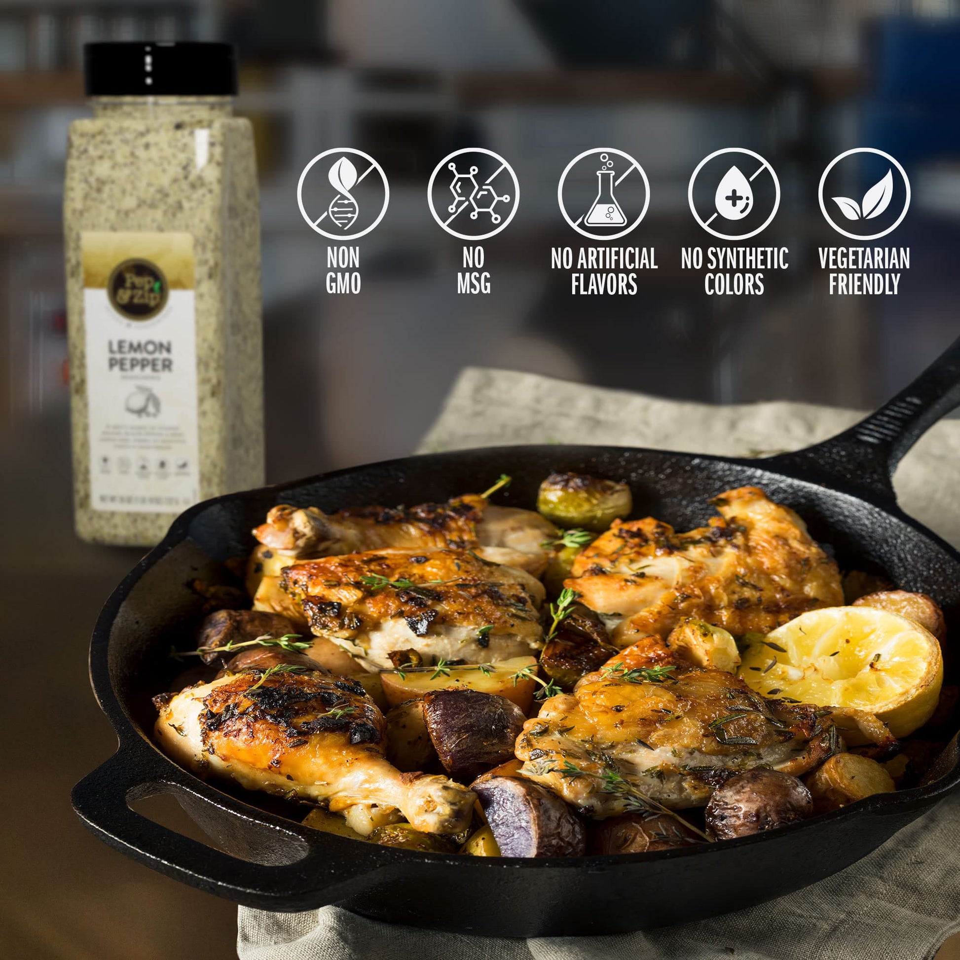 Q: Is this seasoning gluten-free and suitable for special diets?A: Yes, Pep and Zip Lemon Pepper Seasoning is Non-GMO, Kosher, and certified vegetarian, making it suitable for various dietary preferences.