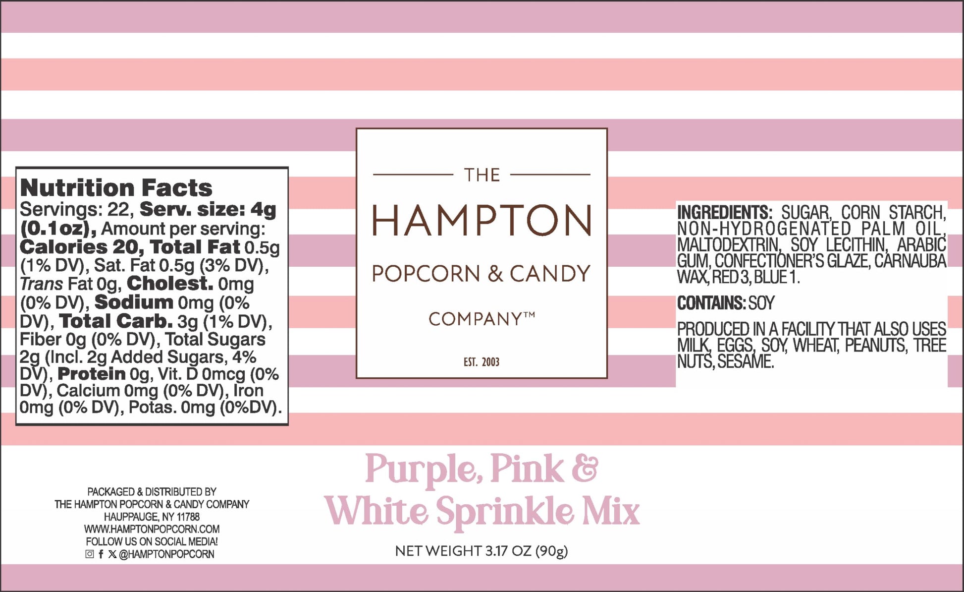Q: What is the size of the jar, and how many servings does it contain?A: The Pink, Purple & White Sprinkles come in a 3.17-ounce jar, which provides enough sprinkles for multiple decorating projects, whether for cupcakes, cakes, or other treats.