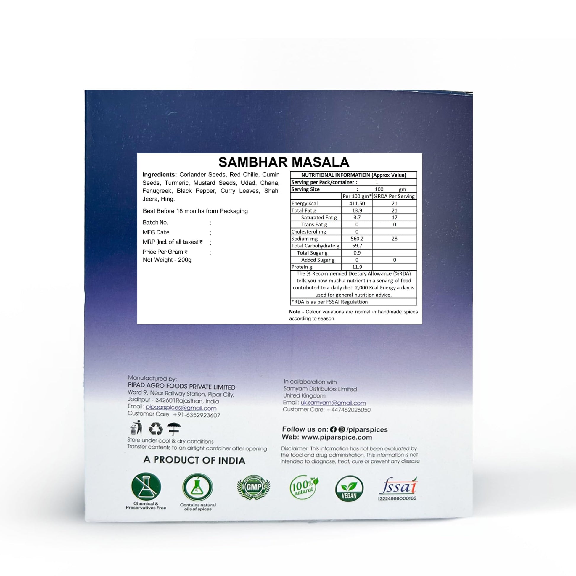 - Q: Who prepares Pipar Spices Sambhar Masala? A: Pipar Spices Sambhar Masala is crafted by a team of rural women, ensuring not only quality but also supporting local communities. This ethical approach adds value to your purchase, knowing you are contributing to sustainable livelihoods.