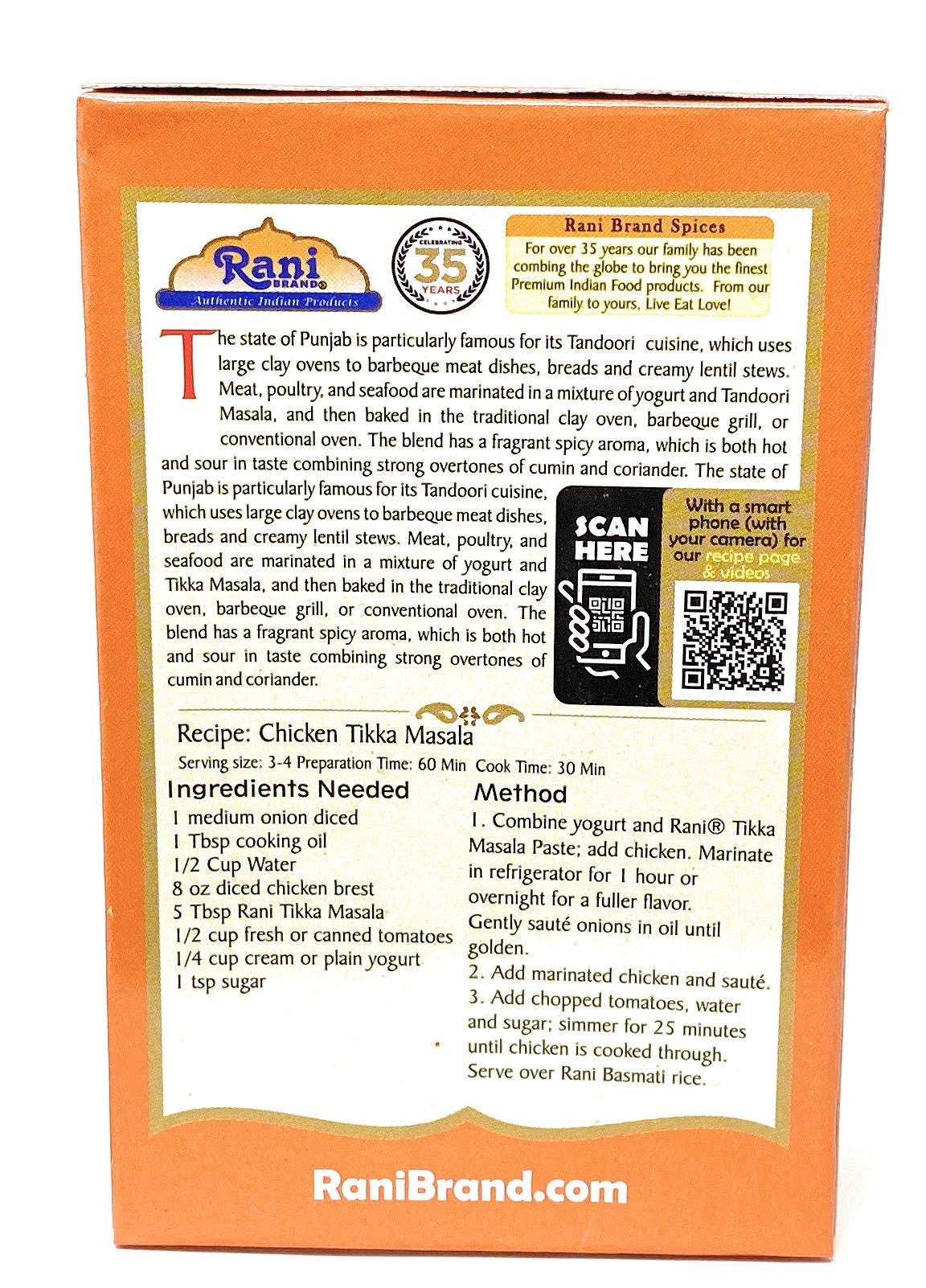 Q: What is the packaging of Rani Tikka Masala like?A: Rani Tikka Masala comes in a 3.5-ounce (100g) plastic bag that is designed for easy storage. The bag is re-sealable, allowing you to keep the spices fresh for long periods after opening.