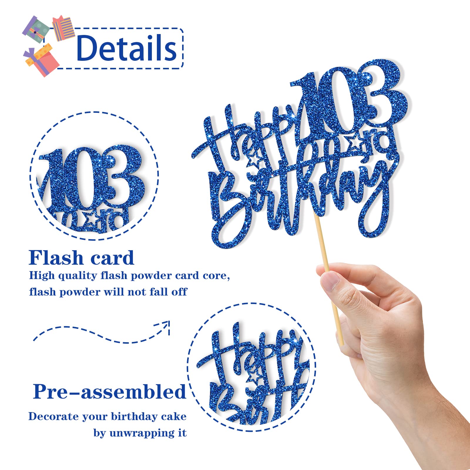 Q: What occasions is the RoadSea 103rd Birthday Cake Topper suitable for?A: This cake topper is ideal for celebrating a 103rd birthday party, adding a special touch to the festivities with its blue glitter design.
