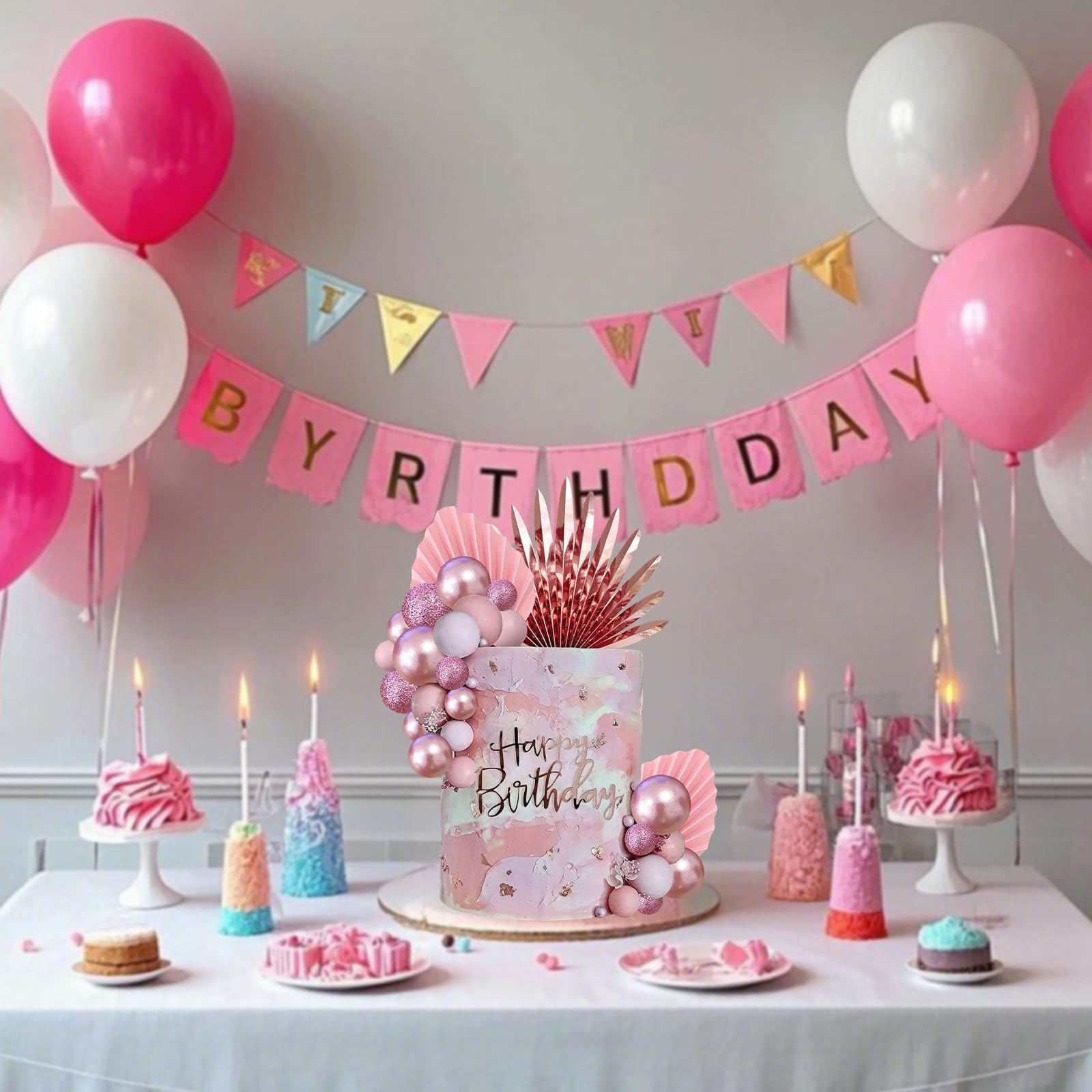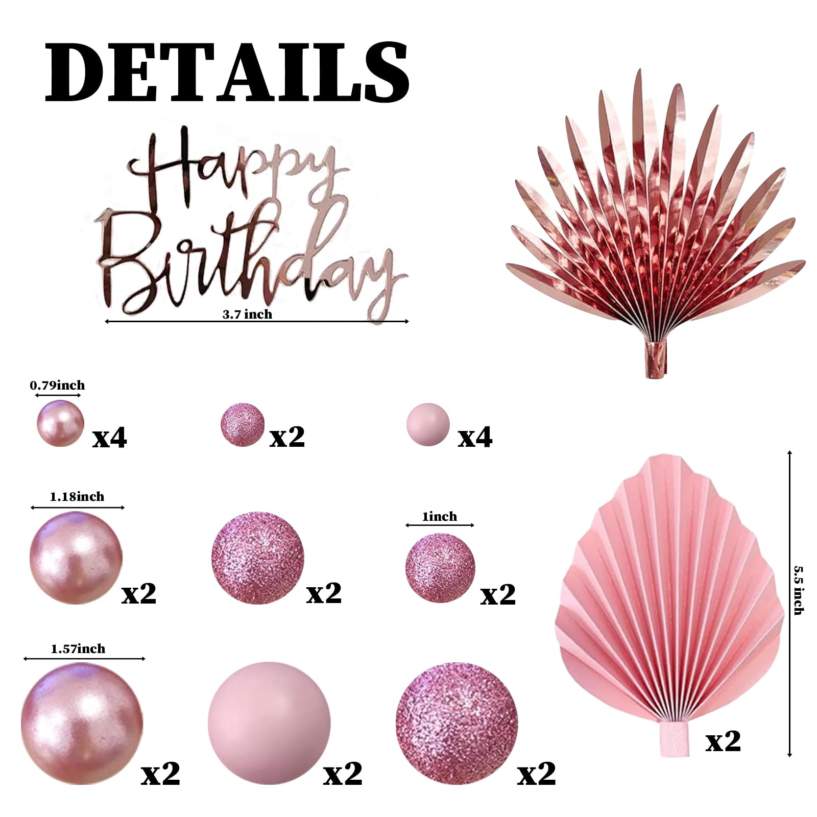Q: What is included in the Rose Pink Cake Toppers set?A: The Rose Pink Cake Toppers set includes 8 rose pink balls in 3 different sizes, 6 pink balls in 3 sizes, 8 rose balls, 3 pink palm leaves, and 1 'Happy Birthday' topper, making it a complete decoration kit for your birthday celebrations.