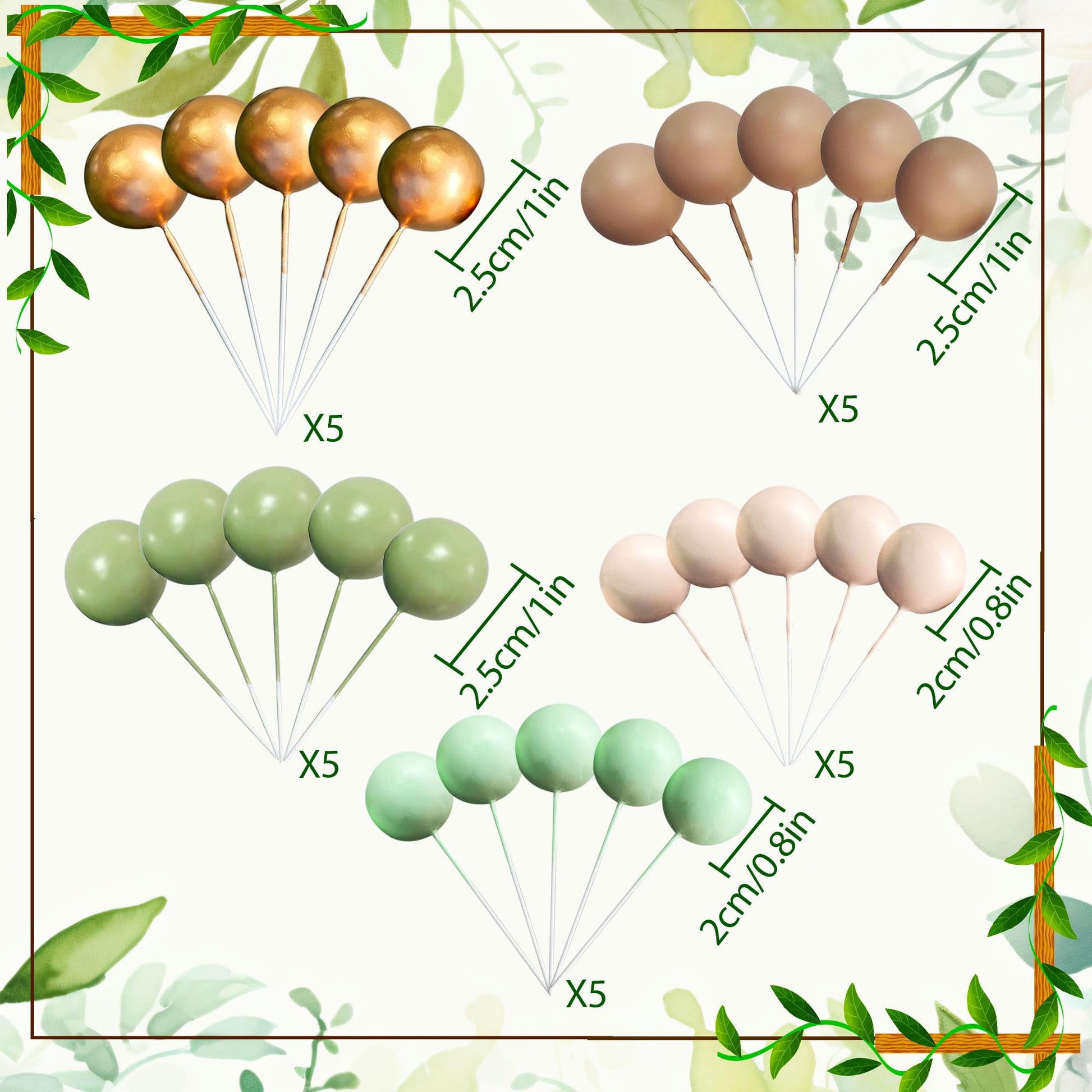Q: How many cake decoration balls are included in the set?A: Each set includes a total of 25 cake decoration balls: 5 green balls, 5 light green balls, 5 beige balls, 5 brown balls, and 5 gold balls, providing a colorful assortment for your cake decoration needs.