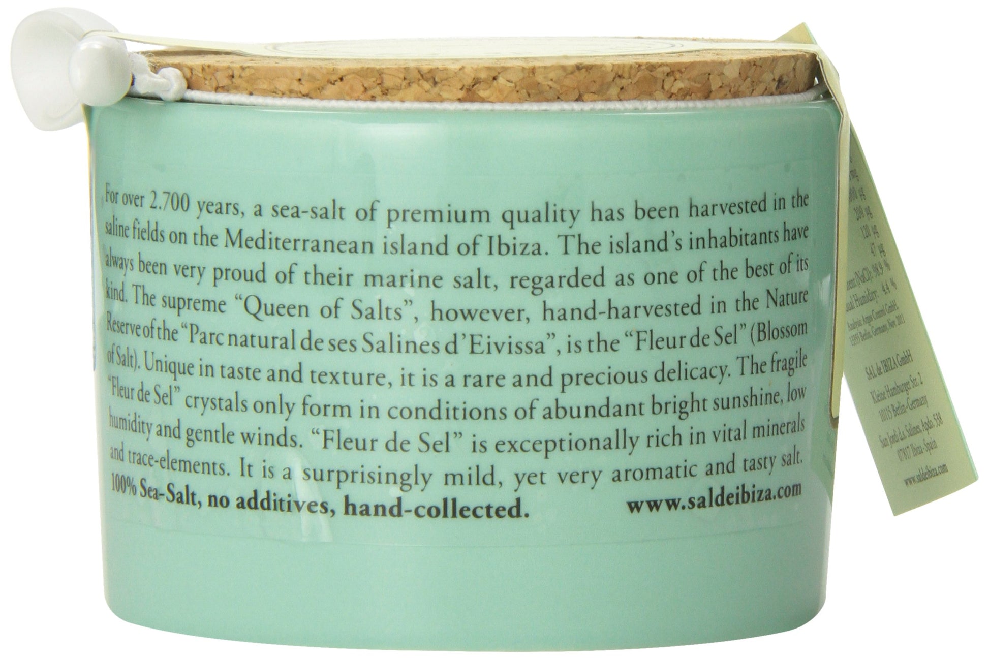 - Q: What is the packaging of Sal de Ibiza Fleur de Sel like? A: Sal de Ibiza Fleur de Sel comes in a beautifully designed light blue ceramic jar with a cork top. The jar includes a ceramic spoon for easy dispensing, making it both functional and aesthetically pleasing for your kitchen or dining table.