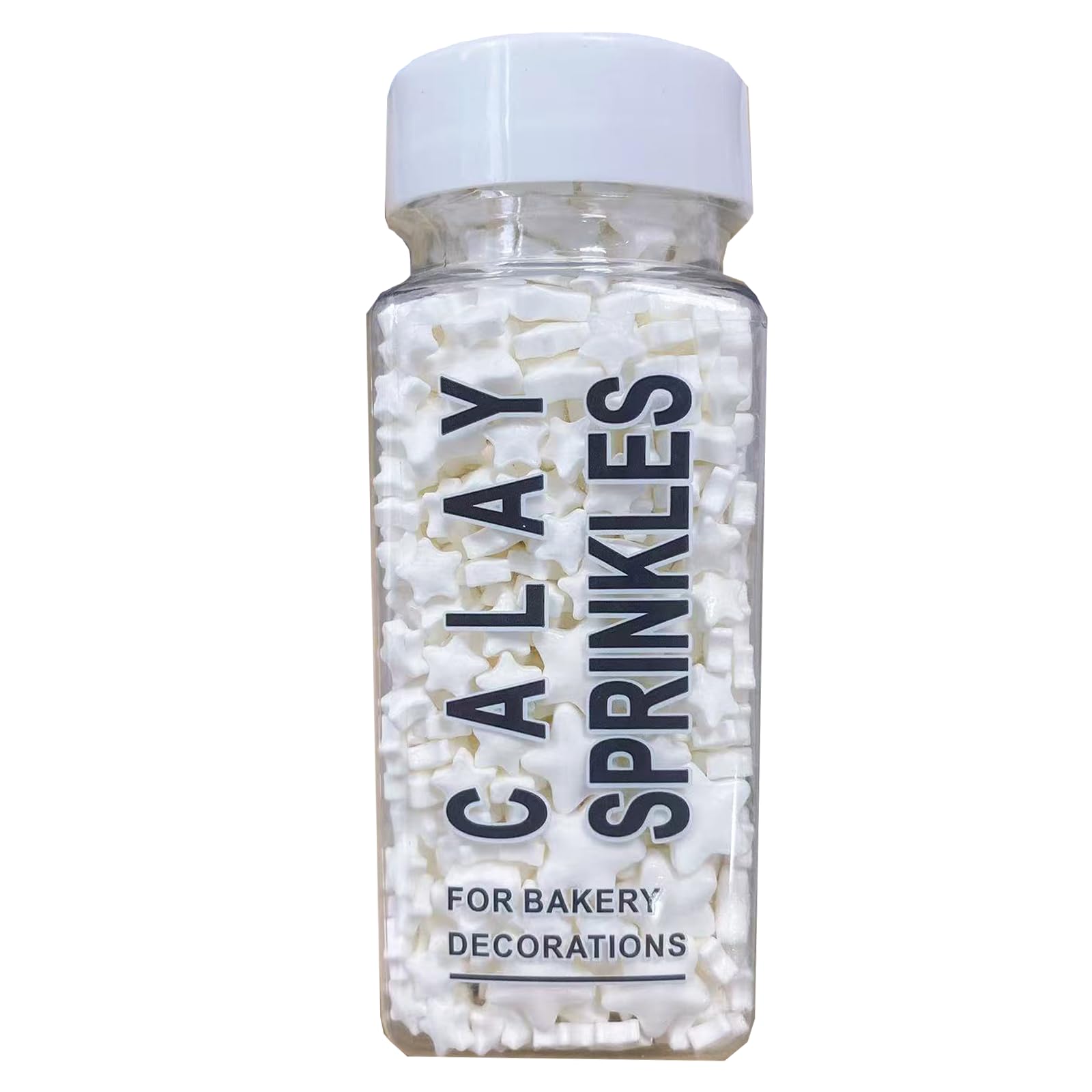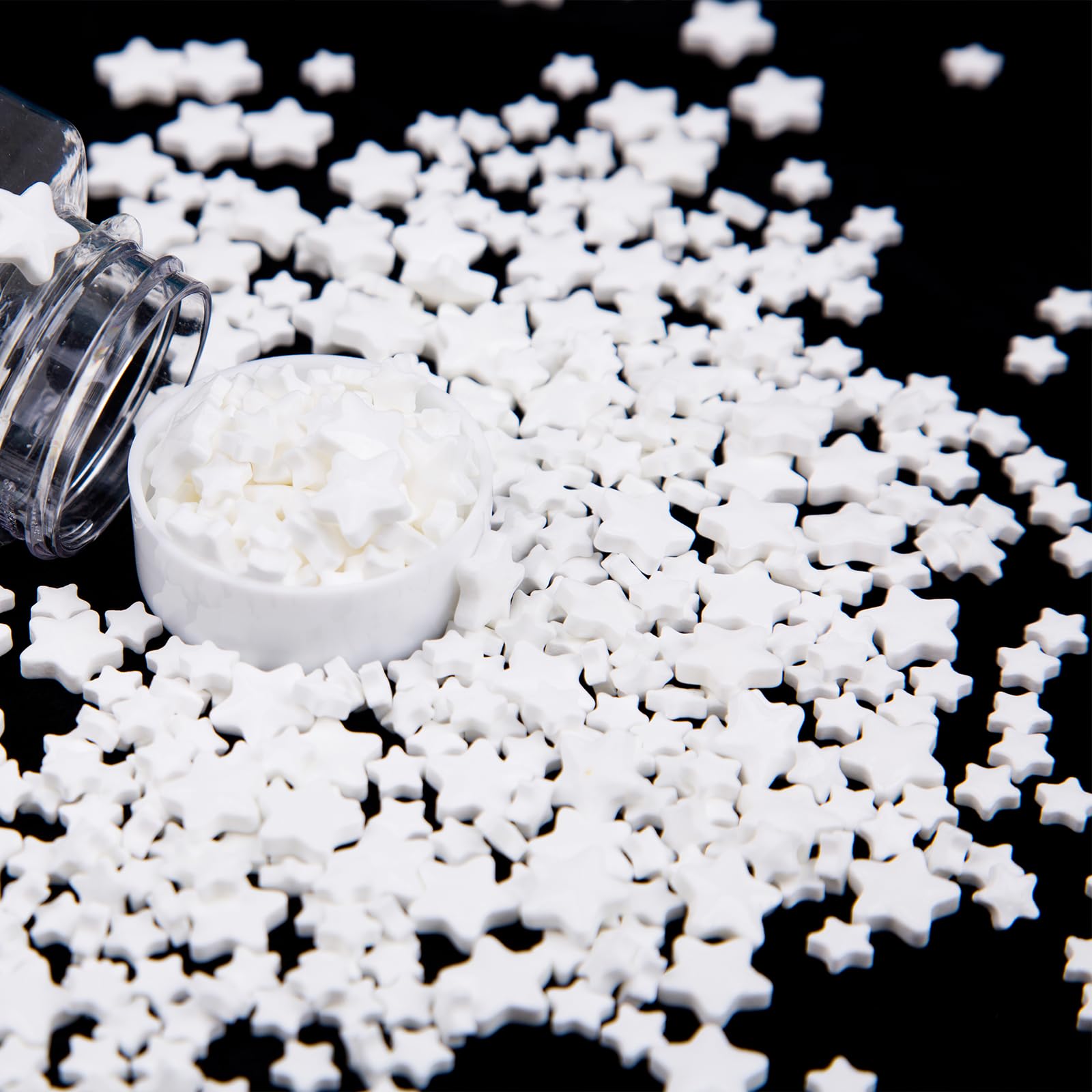 Q: Are the White Star Sprinkles safe to eat?A: Absolutely! The White Star Sprinkles are made from food-safe edible sugar crystals, making them safe for consumption. They can be used to enhance the visual appeal of desserts and beverages.