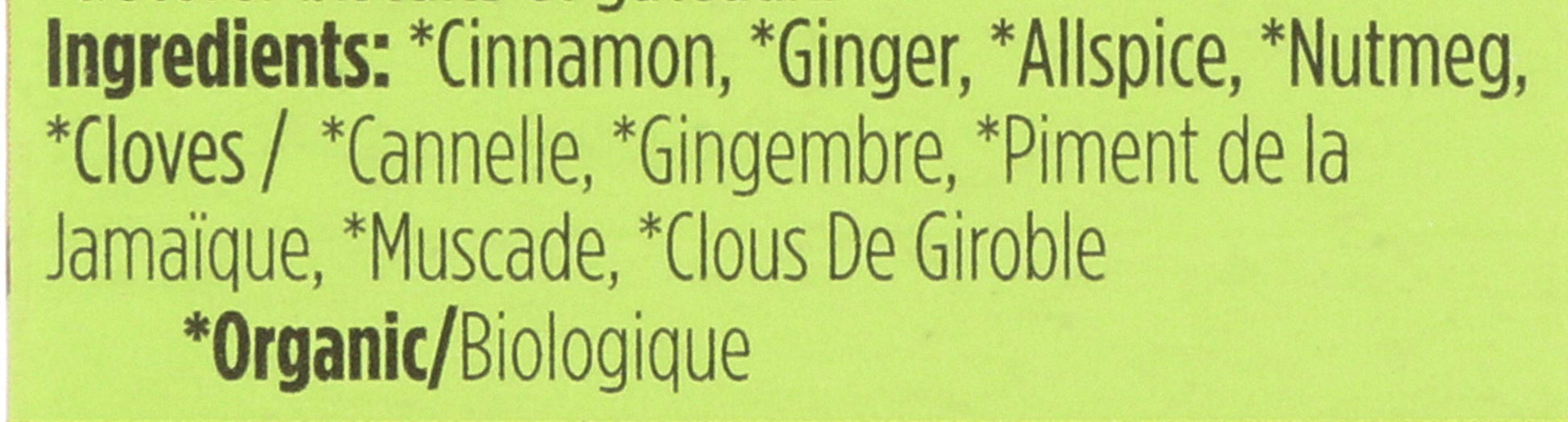 - Q: What ingredients are included in the Spicely Organic Pumpkin Pie Spice? A: The Spicely Organic Pumpkin Pie Spice includes a blend of organic cinnamon, organic nutmeg, organic ginger, organic cloves, and organic allspice, providing a rich and aromatic flavor perfect for your baking needs.