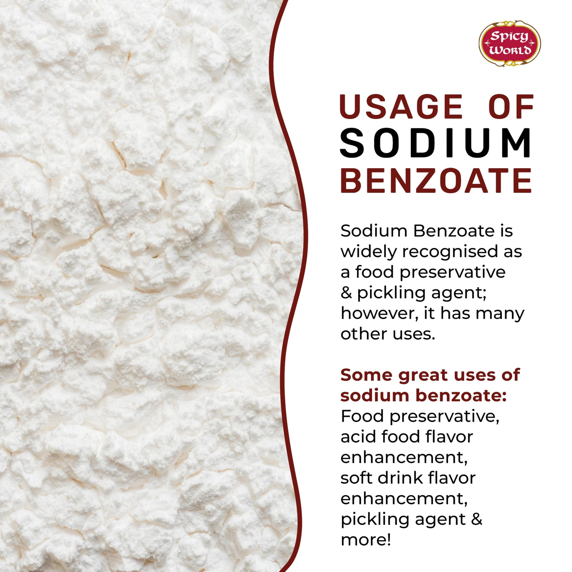 - Q: Is Spicy World Sodium Benzoate safe for food use? A: Yes, Spicy World Sodium Benzoate is USP and food grade, making it safe for use in food products. It is the first preservative approved by the FDA and is widely used in various food applications.