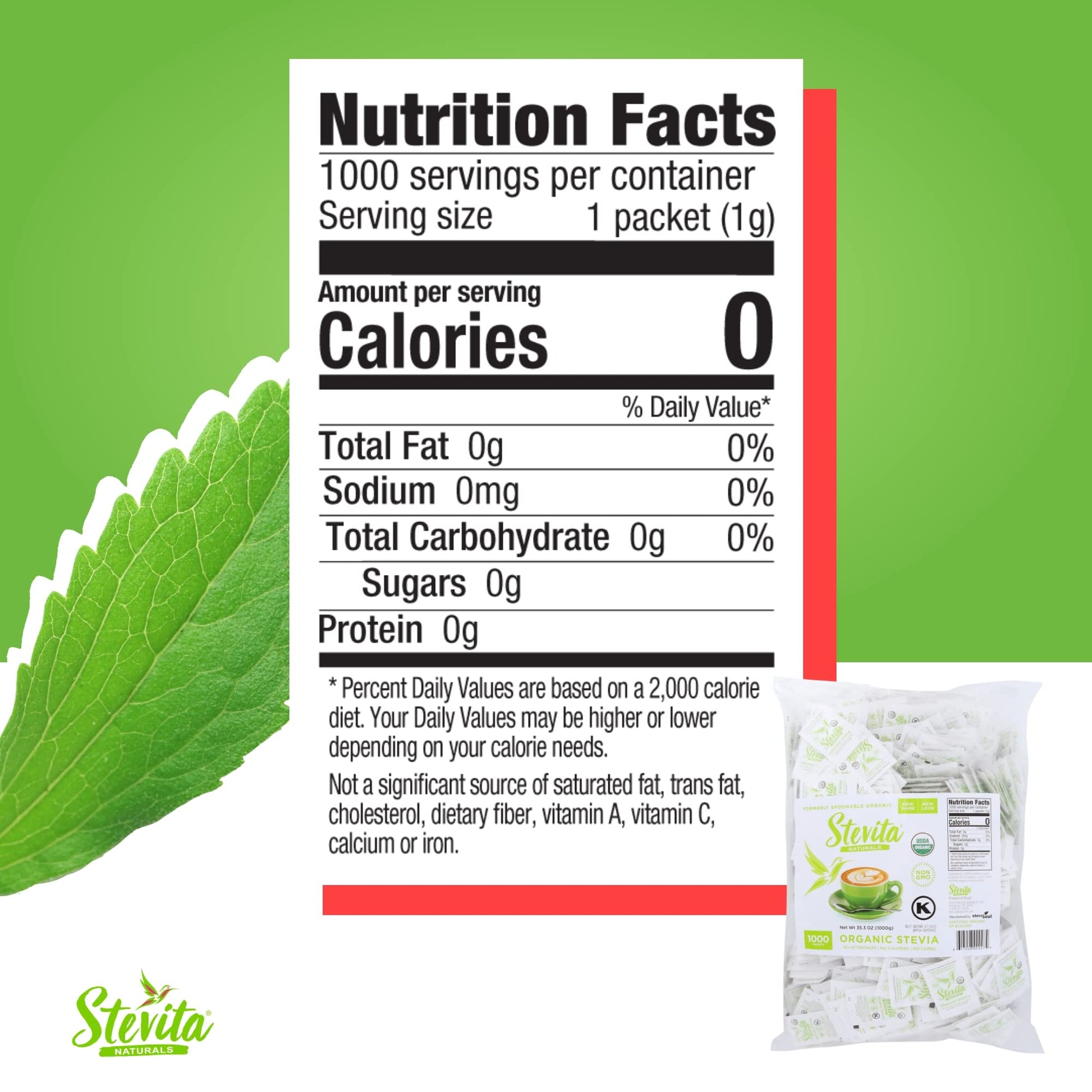 Q: How many servings are in a box of Stevita Organic Stevia?A: Each box of Stevita Organic Stevia contains 1000 packets, providing you with 1000 servings of this all-natural sweetener.
