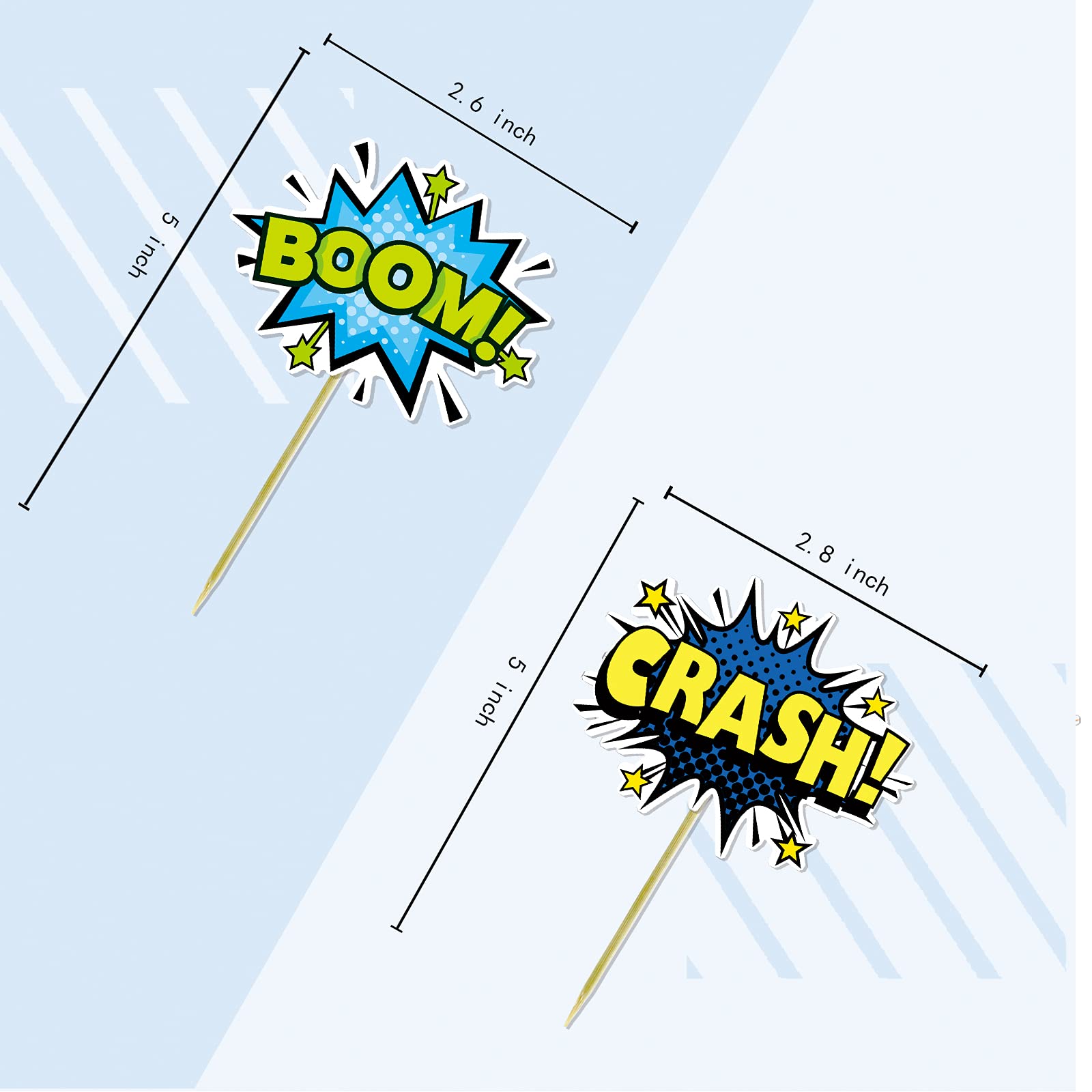 Q: What are the dimensions of the SuperHero Boom Cupcake Toppers?A: Each cupcake topper is approximately 5 inches tall, including both the card and the bamboo stick.