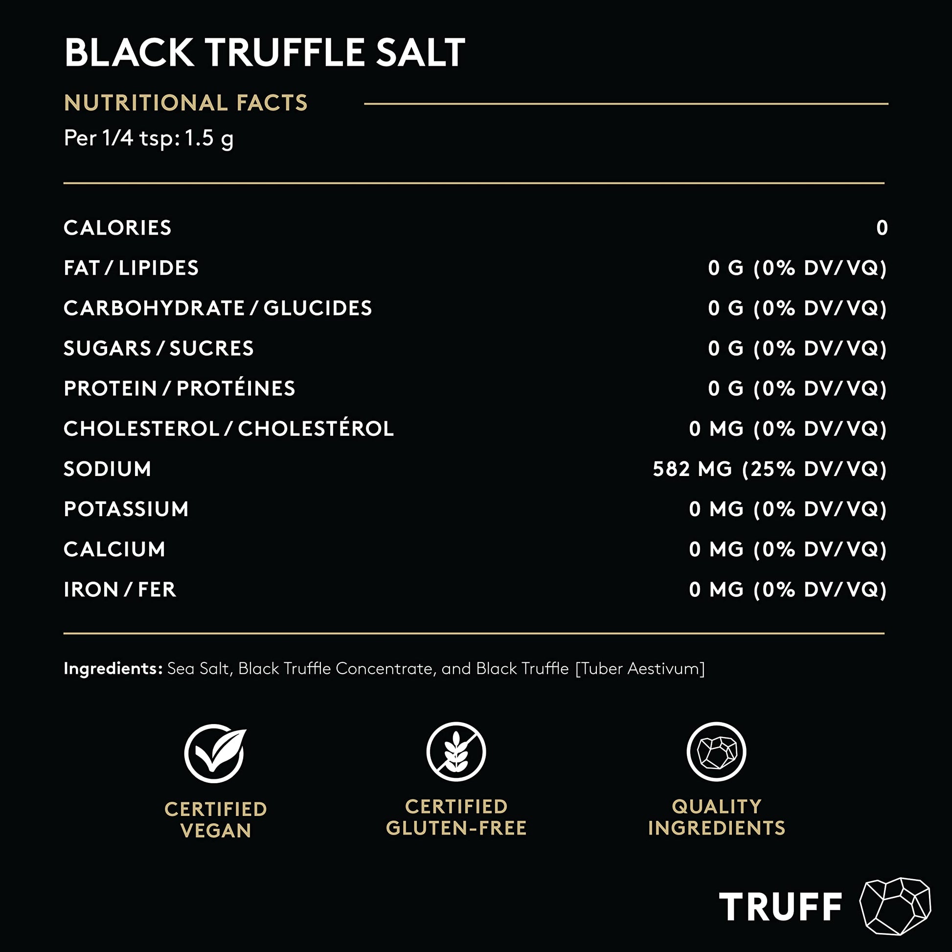 Q: What is TRUFF Black Truffle Salt made of?A: TRUFF Black Truffle Salt is crafted from a blend of fine and coarse sea salt combined with flecks of dried black summer truffles, ensuring a rich aroma and unique flavor.