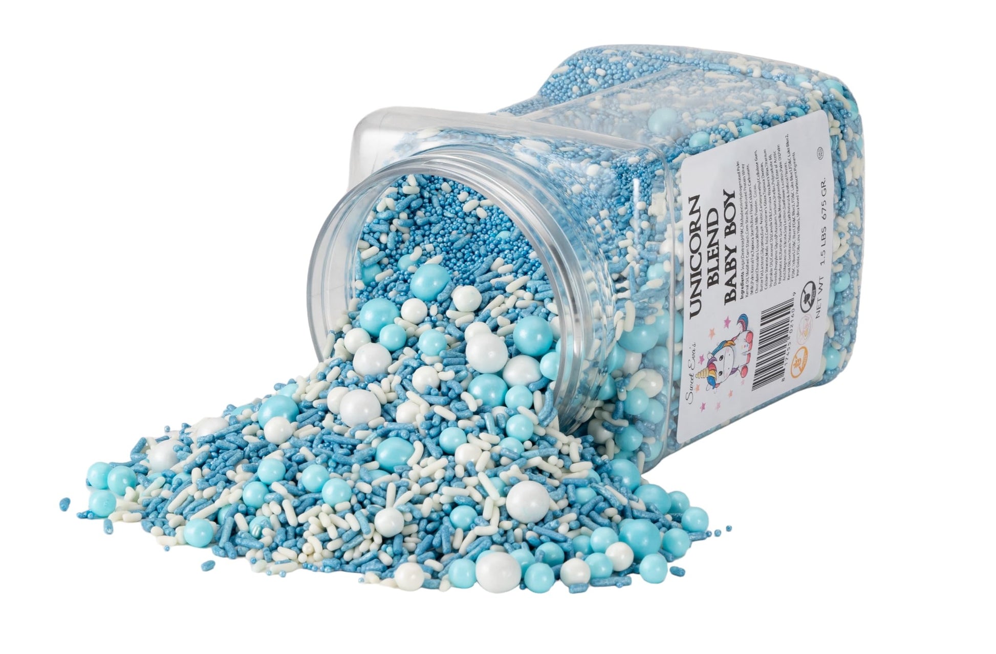 Q: What is the size and weight of the Unicorn Blend sprinkles package?A: The Unicorn Blend Baby Boy sprinkles come in a large 1.5-pound package, ensuring you have plenty of sprinkles to decorate multiple treats and occasions.
