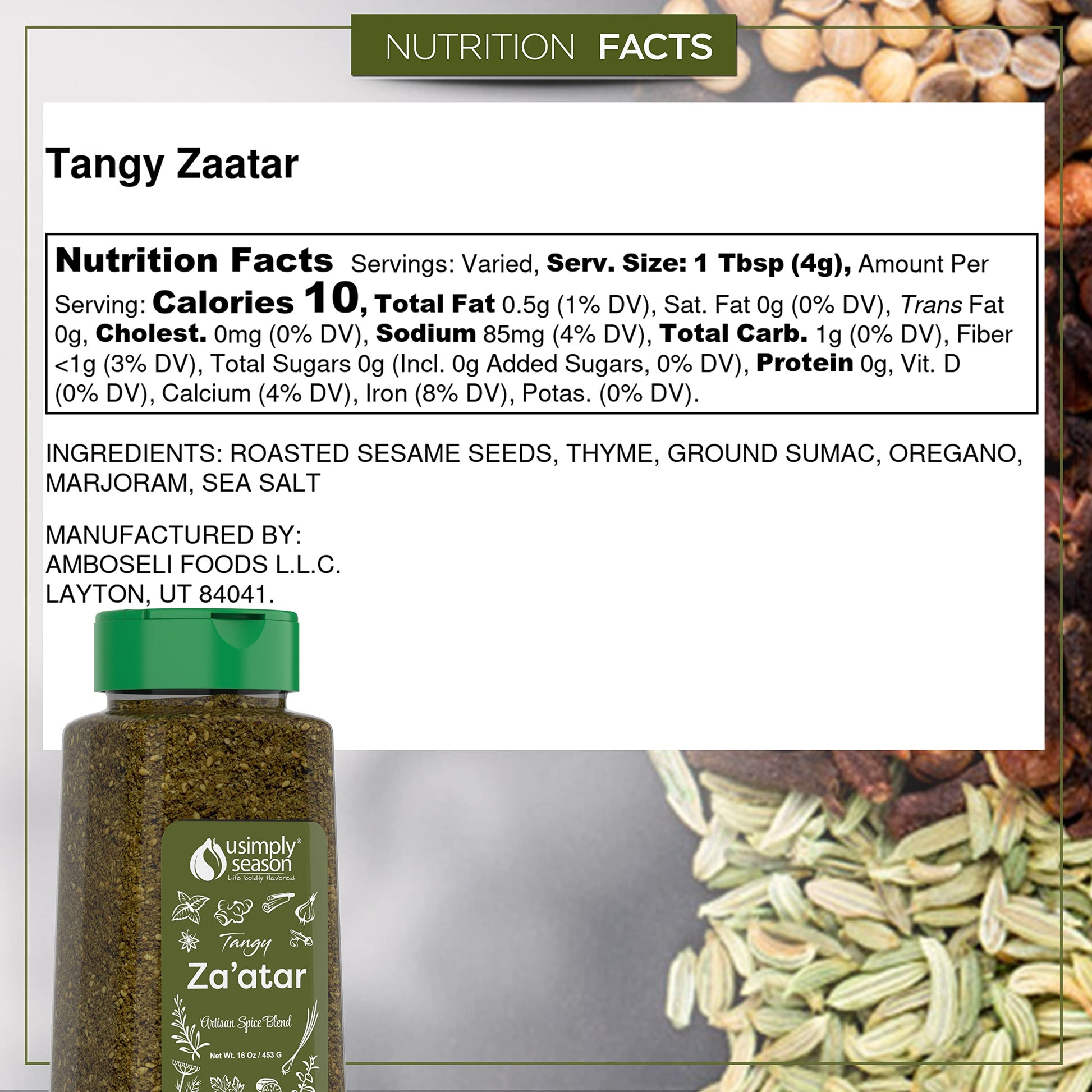 - Q: Can I use Zaatar spice in recipes for a paleo or keto diet? A: Absolutely! USimplySeason Zaatar Spice is a great addition to paleo and keto diets as it contains no additives or preservatives and is made from all-natural ingredients, making it a flavorful, low-carb seasoning option.
