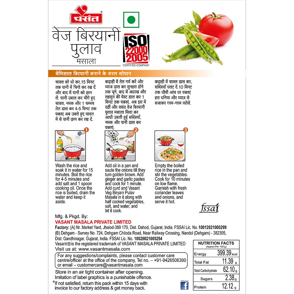 Q: How much Veg Biryani Pulav Masala should I use per serving?A: For optimal flavor, it is recommended to use about 1 to 2 teaspoons of Veg Biryani Pulav Masala per cup of rice or vegetables, adjusting to your taste preference.