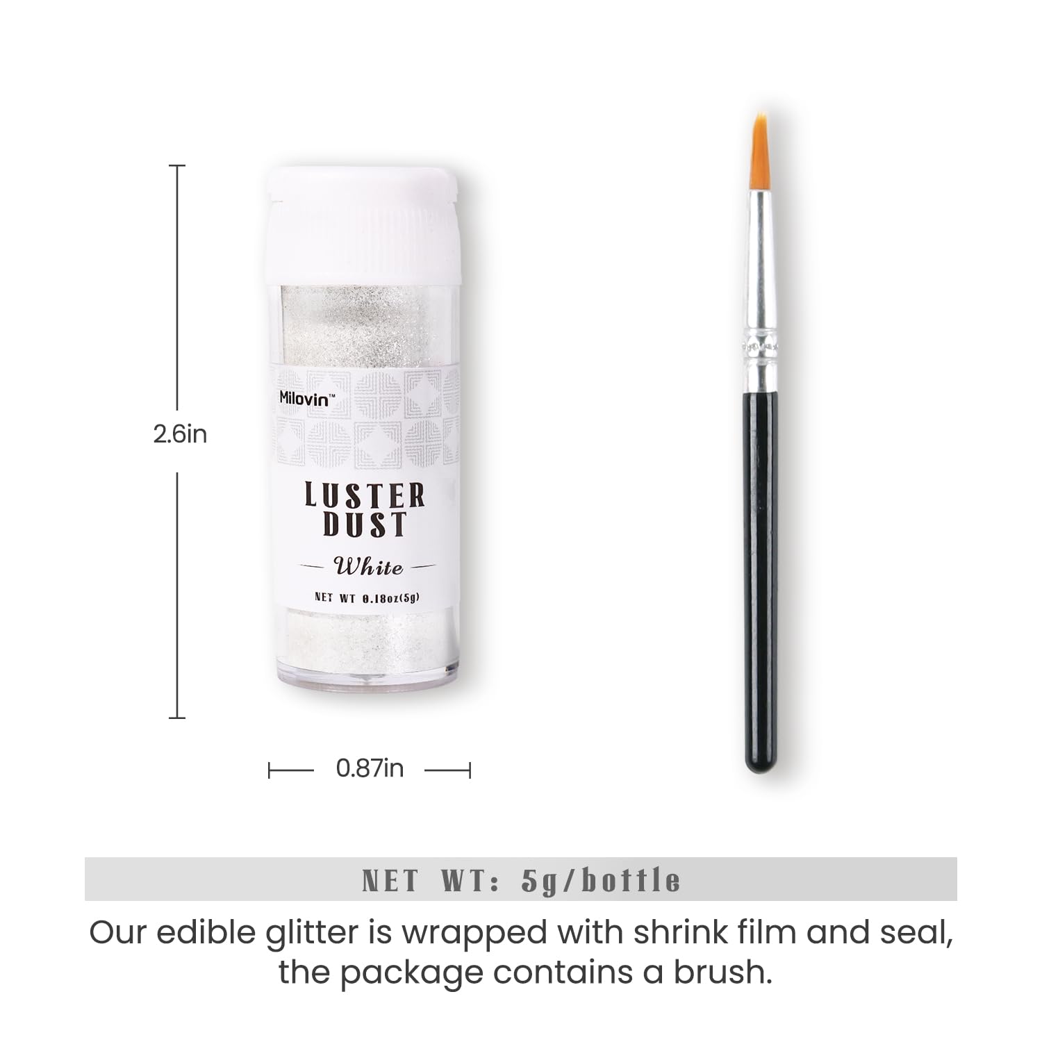 White Edible Glitter: Made Of Food-Grade Mica Powder And Food Coloring, Odorless, And Tasteless. It Makes The Food Add A Magical Color And More Vivid, And It Doesn'T Affect The Texture! Vegan, Nut-Free, Gluten-Free, Adults Or Kids Can Be Safe To Use. | Wide Application: White Luster Dust Edible For Cakes, Cupcakes, Baking, Chocolates, Macarons, Cookies, Pop Cakes, Strawberries, Etc. But Also Can Have A Shimmering Effect In Wine, Vodka, Cocktails, Drinks, And Champagnes. | Easy To Use: You Just Need To Tap The Bottle Lightly, Then Sprinkle The Edible Luster Dust On Top Of Your Food Or Drink. (The Powder Will Be Affected During Transportation, It May Seem Smaller, But The Weight Of The Product Is Right) | How To Store: Doule Open Bottle Wrapped With Shrink Film And Seal To Ensure Hygiene. Please Use Them As Soon As Possible When Opening. Store It In A Cool Dry Place And Avoid Direct Sunlight And A Moist Environment. | Various Colors Available To Choose: Our Edible Glitter Is Available In 8 Different Colors, Gold, Rose Gold, White, Pink, Red, Green, Blue, And Purple. These 5G/Bottle Edible Glitter Offer More Options For Your Creations.