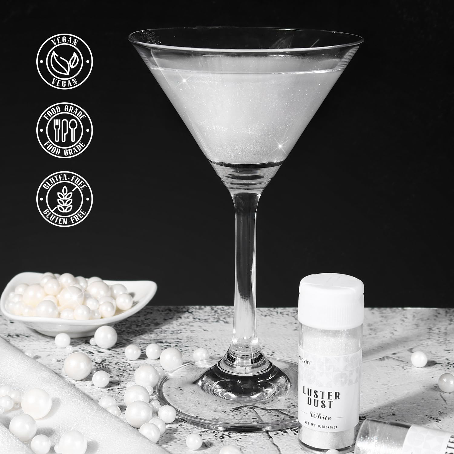 Q: Can I use this edible glitter in drinks?A: Absolutely! The white luster dust can add a beautiful shimmering effect to drinks like wine, cocktails, and champagnes, making your beverages more visually appealing.