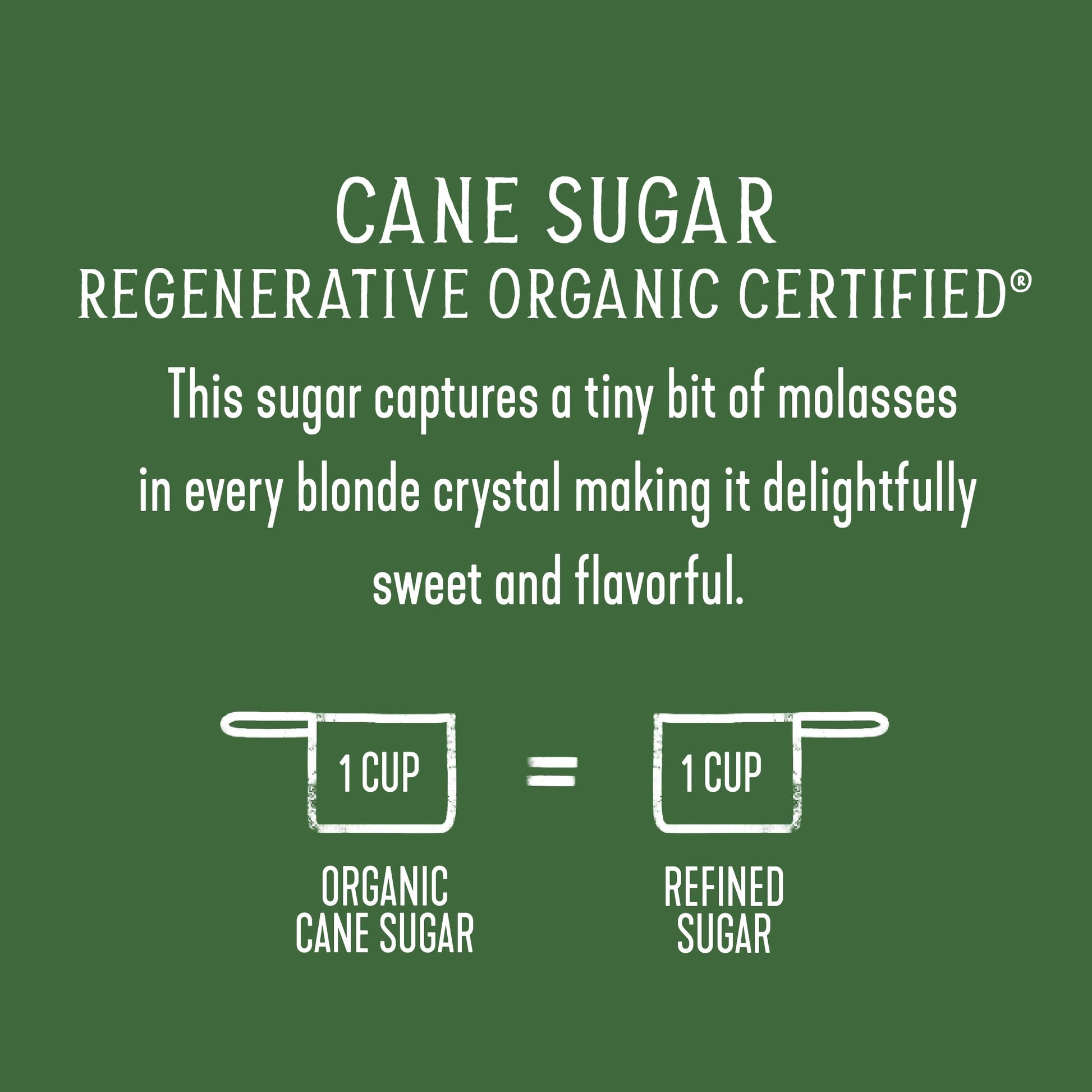 - Q: What are the environmental benefits of using Regenerative Organic Cane Sugar? A: Using Regenerative Organic Cane Sugar supports eco-friendly agriculture practices that improve soil health, capture carbon, and promote sustainable farming. This sugar is sourced from farms in South America that prioritize environmental stewardship.