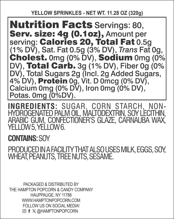 Q: Do yellow sprinkles contain any allergens?A: The ingredient list does not specify any hazardous materials, but it’s always best to check the packaging for allergen information if you have specific dietary concerns.
