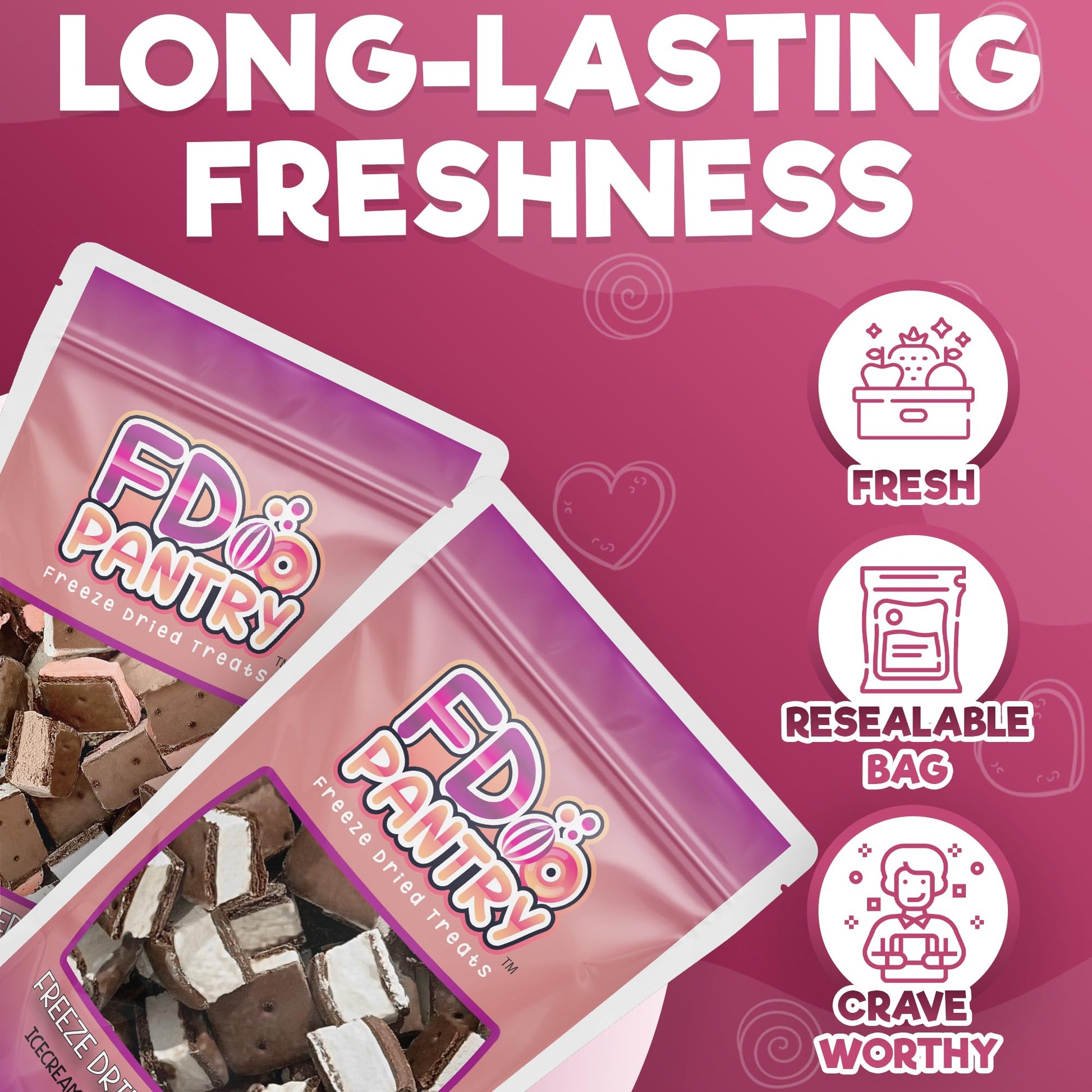 Freeze-Dried Ice Cream Sandwich Neapolitan Bites bring a revolutionary snacking experience right to your fingertips. Our unique freeze-drying process locks in the creamy Strawberry, Vanilla, Chocolate flavor and transforms it into a crunchy, delectable treat. Packaged in a convenient, (2 Pack) resealable 2.5oz bag, these ice cream bites stay fresh, making them a perfect snack for any adventure or a thoughtful gift for those who appreciate the novelty and joy of Freeze-Dried food. Dehydrated Ice Cream Sandwich Bites Whether it s a part of your emergency food kit, a sweet treat for your outdoor adventures, or a unique gift, our freeze-dried candy offers unparalleled ease and taste. Dive into the world of FD Pantry and explore our range of flavors for even more fruity fun. Make every moment special with a snack that s out of this world!
