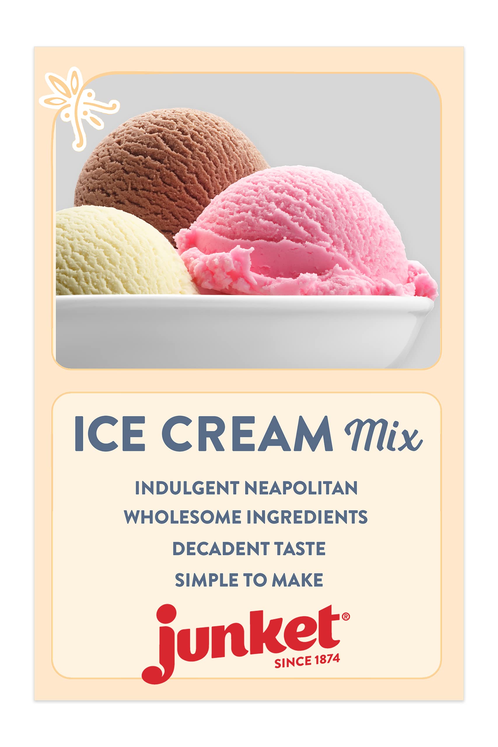 Junket Ice Cream Mix Bundle - 2 Vanilla, 2 Chocolate, 2 Strawberry (6 Total) Make homemade ice cream quickly and easily with All Natural Junket Ice Cream Mix. Enjoy the delicious simplicity of creamy Very Vanilla, the smoothly rich and decadent flavor of Dutch Chocolate or the all-natural, freshly picked flavor of Simply Strawberry. You could also add your own touch by mixing in nuts, candy or toppings. Gluten free, Junket Ice Cream mix is indulgent, wholesome fun. With this bundle youll get 3 flavors, Very Vanilla, Dutch Chocolate and Simply Strawberry (two boxes each); for buying convenience. The boxes also feature two sets of directions on the back, one that requires an ice cream maker, and one that does not. Very Vanilla Ingredients: Sugar, dried corn syrup, non-fat milk powder, guar gum, carrageenan and gum arabic, natural vanilla flavor with other natural flavors. Contains milk products. Dutch Chocolate Ingredients: Sugar, dutched cocoa, dried corn syrup, non-fat milk powder, guar gum, carrageenan and gum arabic. Contains milk products and soy lecithin. Simply Strawberry Ingredients: Sugar, dried corn syrup, non-fat milk powder, natural strawberry with other natural flavors, beet juice, guar gum, carrageenan and gum arabic. Contains milk products.